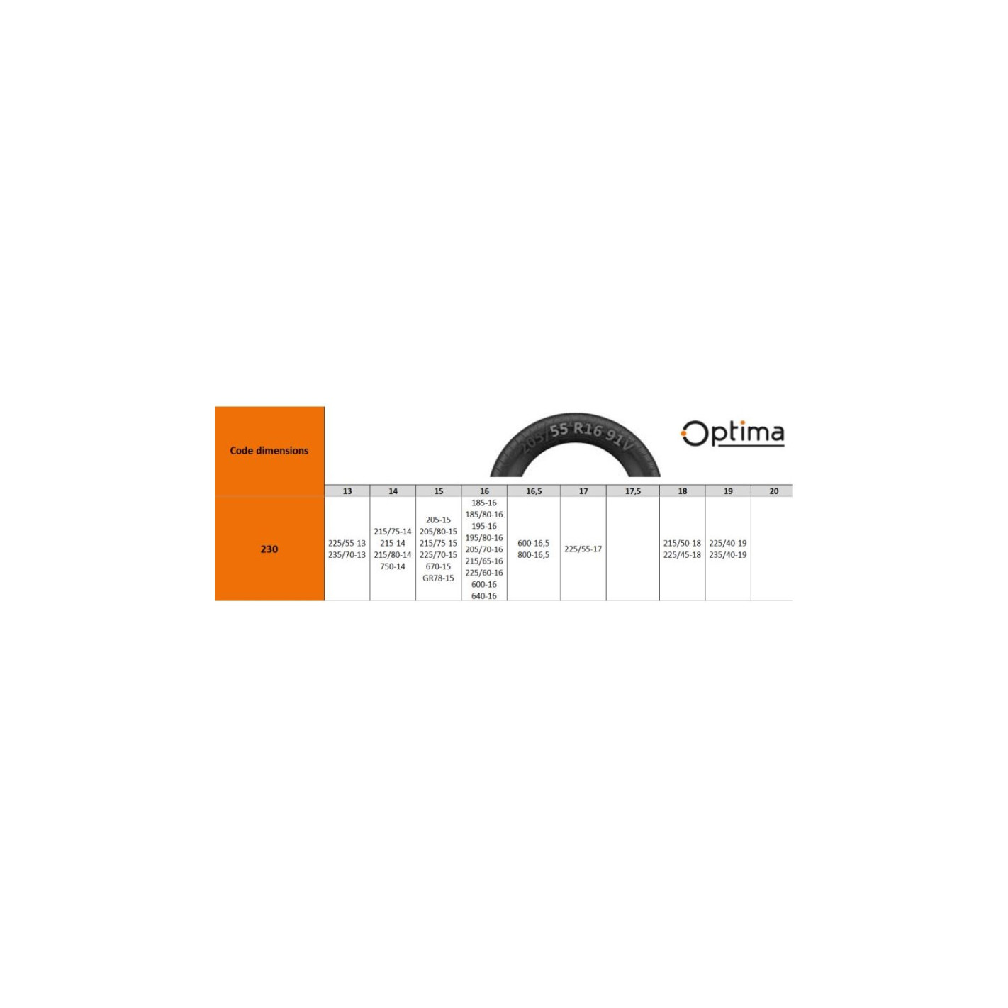 225/55R13 - 235/70R13 - 215/75R14 - 215R14 - 215/80R14 - 750R14 - 205R15 - 205/80R15 - 215/75R15 - 225/70R15 - 670R15 - GR78R15 - 185R16 - 185/80R16 - 195R16 - 195/80R16 - 205/70R16 - 215/65R16 - 225/60R16 - 600R16 - 640R16 - 600R16,5 - 800R16,5 - 225/55R17 - 215/50R18 - 225/45R18 - 225/40R19 - 235/40R19