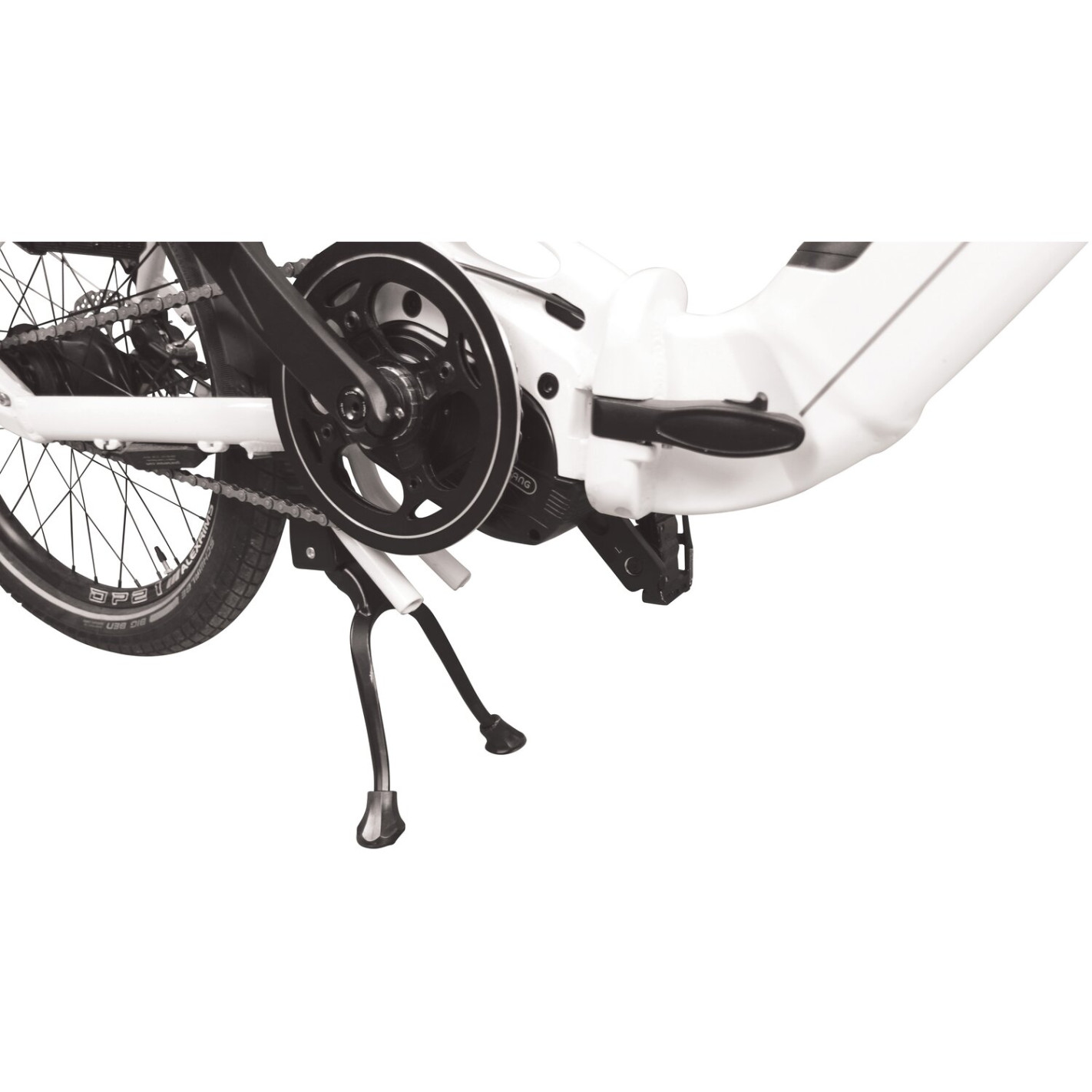 La béquille est centrale, ce qui augmente encore le sentiment de sécurité. Les béquilles centrales confèrent stabilité au vélo llors du stationnement.