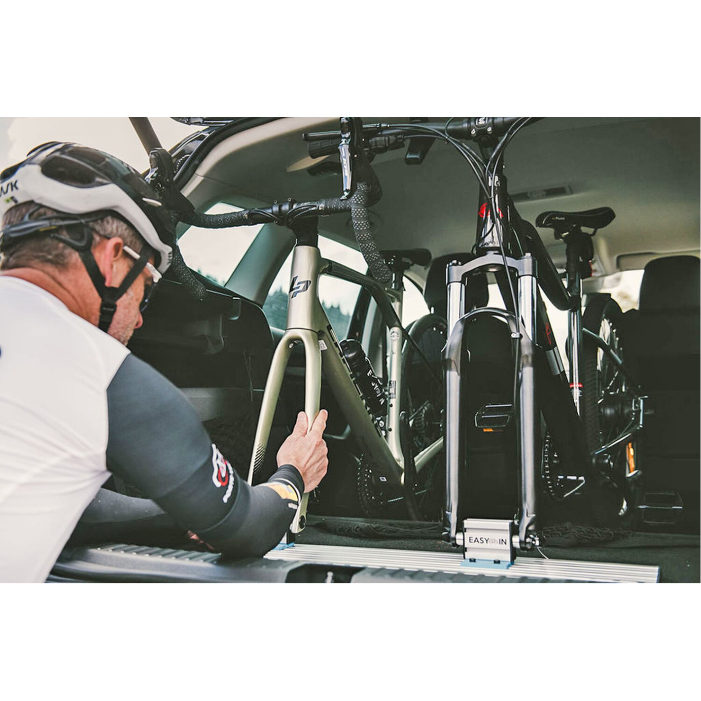 EasyIn est livré avec 2 supports de fourche (aluminium ou PUselon modèle) pour le transport de 2 vélos. Il peut transporter jusqu'à 4 vélos (avec support de fourche universel en option). Les adaptateurs pour le montage de la fourche sur le support universel ne sont pas fournis. Ils doivent être choisis en complément en fonction des caractéristiques du vélo.