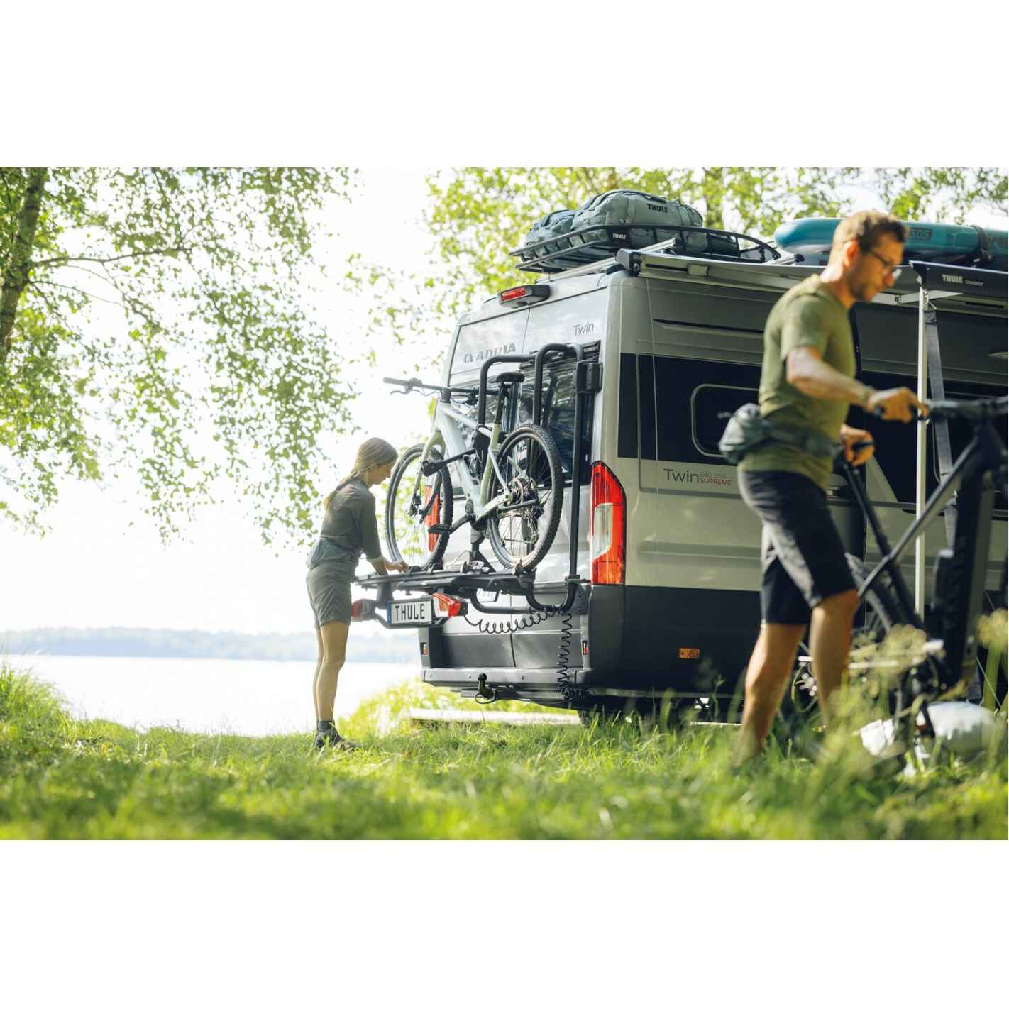 Le Thule VeloTrack Frame a été pensé pour les fourgons aménagés modernes comme les Ducato, Jumper, Boxer (dès 2006) ou encore l’Opel Movano (dès 2022). Ce porte-vélos nouvelle génération combine robustesse et praticité pour transporter jusqu’à 3 vélos, y compris les modèles électriques, VTT ou fat bikes, sans gêner l’ouverture des portes arrière. Avec ses rails longs de 150 cm, son espacement confortable de 23 cm et sa capacité de charge de 60 kg, il répond parfaitement aux besoins des voyageurs qui embarquent des vélos lourds. Autre atout : l’installation est simple, sans perçage, et peut se démonter facilement en fin de saison. Côté confort, Thule a prévu plusieurs hauteurs de montage pour faciliter le chargement, surtout avec des vélos électriques.