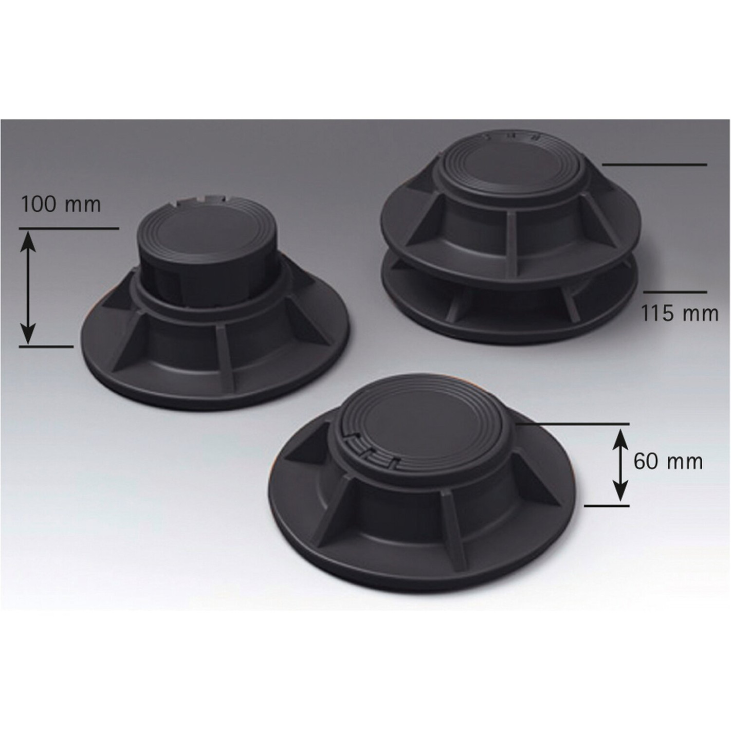 Diamètre 220mm. 4 hauteurs possibles de 60mm à 150mm. Résistance : 1 tonne. Housse de rangement. Le lot de 2.