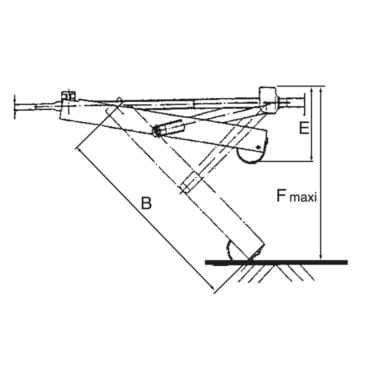 Manivelle non fournie. Charge admissible par vérin 800 kg. Côte A : 505 mm. Côte B : 470 mm. Côte C : 260 mm. Côte D : 190 mm. Côte E : 100 mm. Côte F : 470 mm.