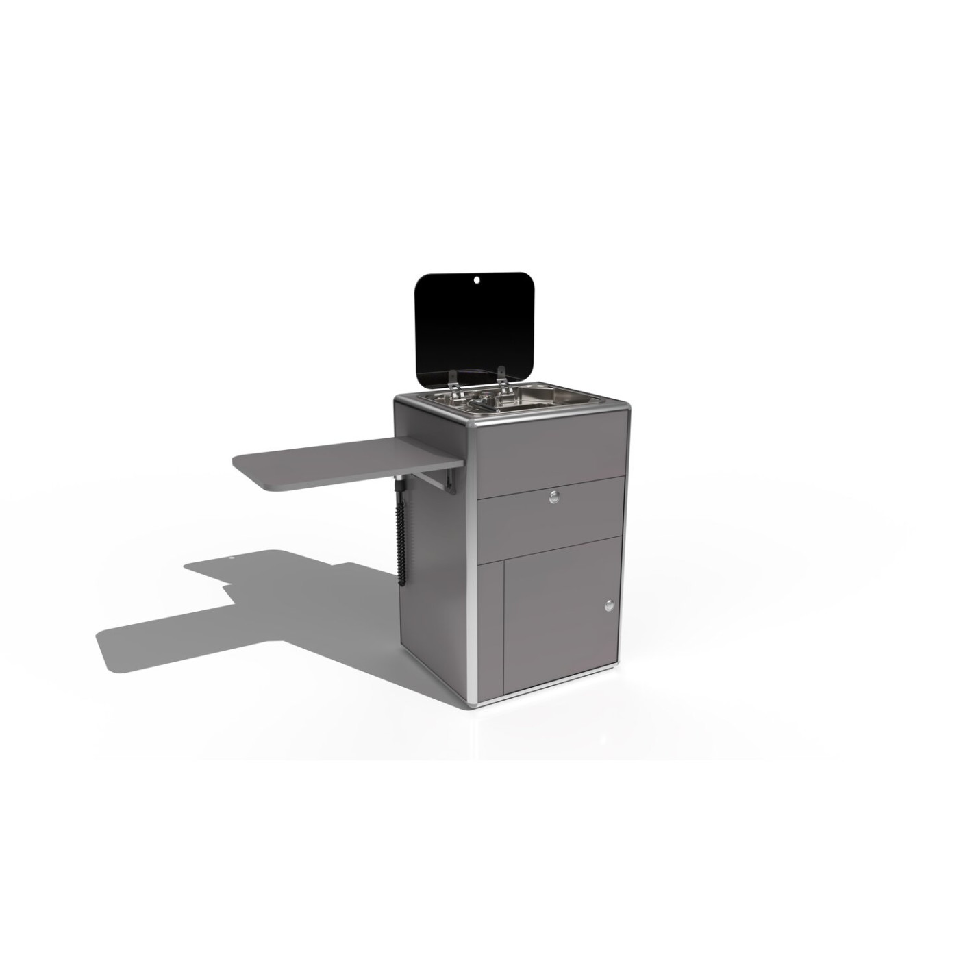 Cette solution amovible et prête à l’emploi est pensée pour un usage pratique en van. Elle comprend un évier inox avec couvercle en verre, un réchaud à un feu (cartouche non fournie), une tablette de travail latérale, deux jerricans de 13 L, et une pompe immergée 8 L/min.