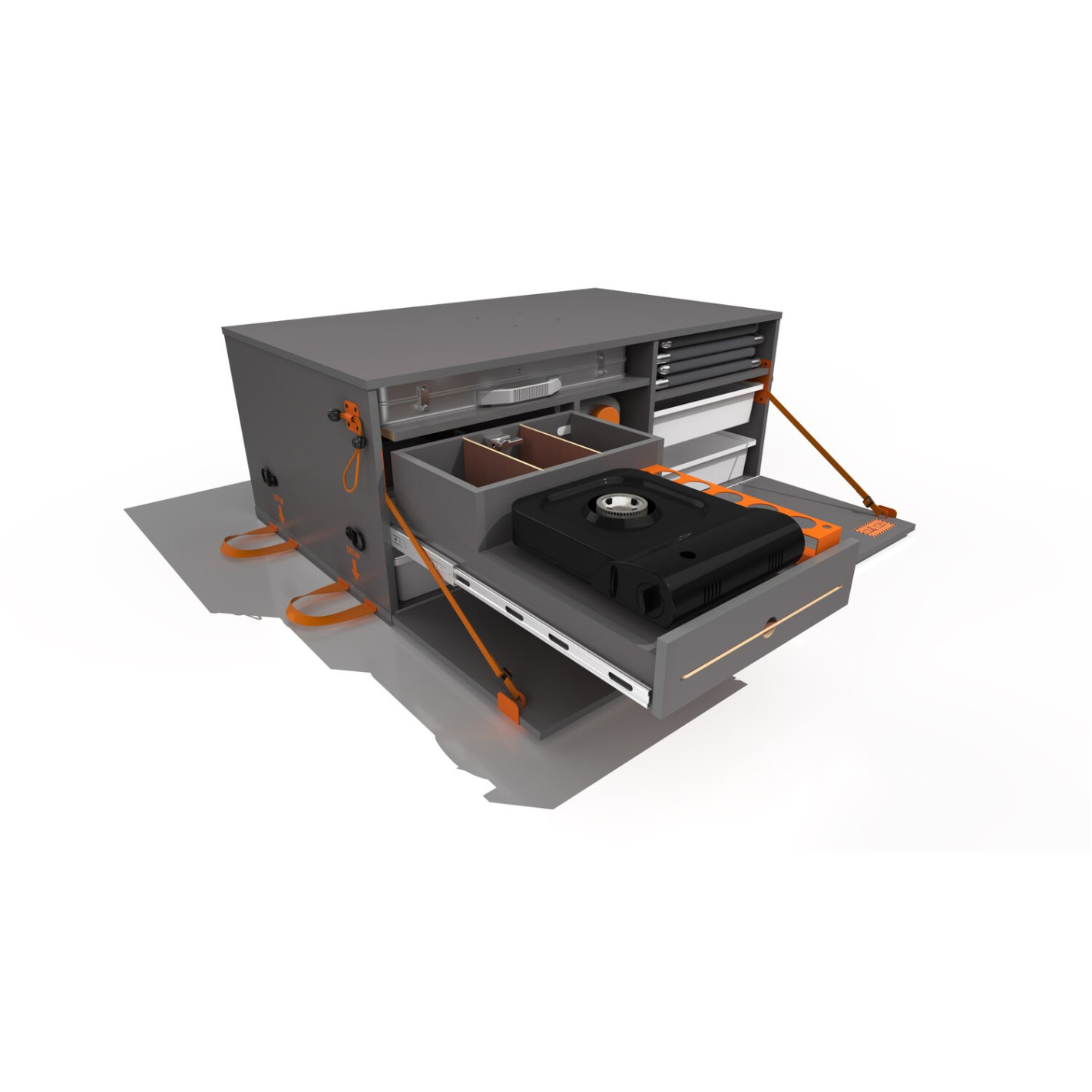 - 1 tiroir coulissant avec : un réchaud à gaz à cartouche avec 1 feu, un range épices latéral, un rangement modulable de 1 à 3 parties à l'arrière du réchaud et une tablette sous le réchaud pouvant être utilisé comme une table à découper