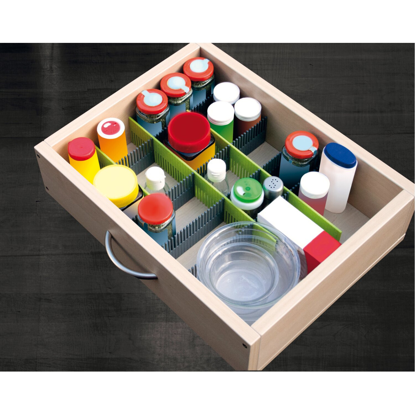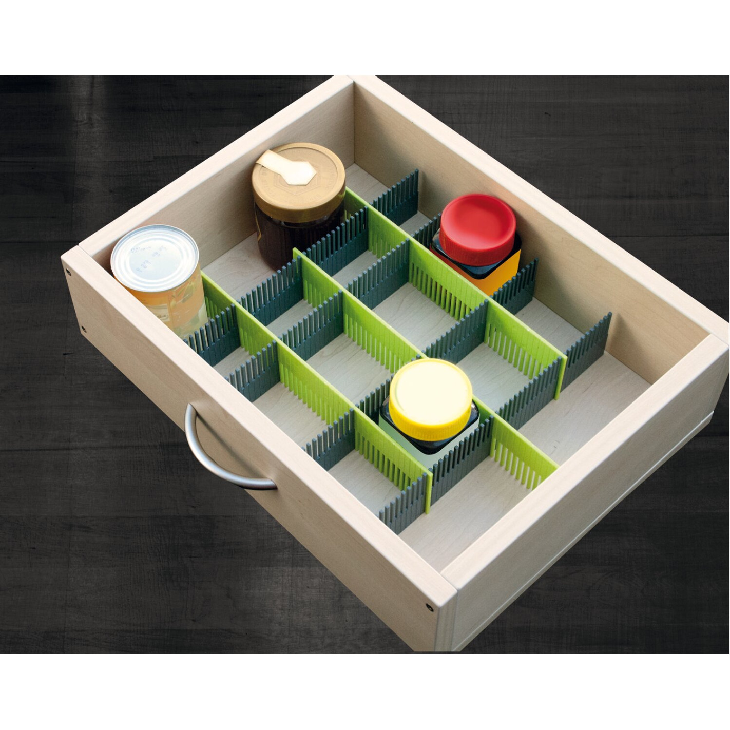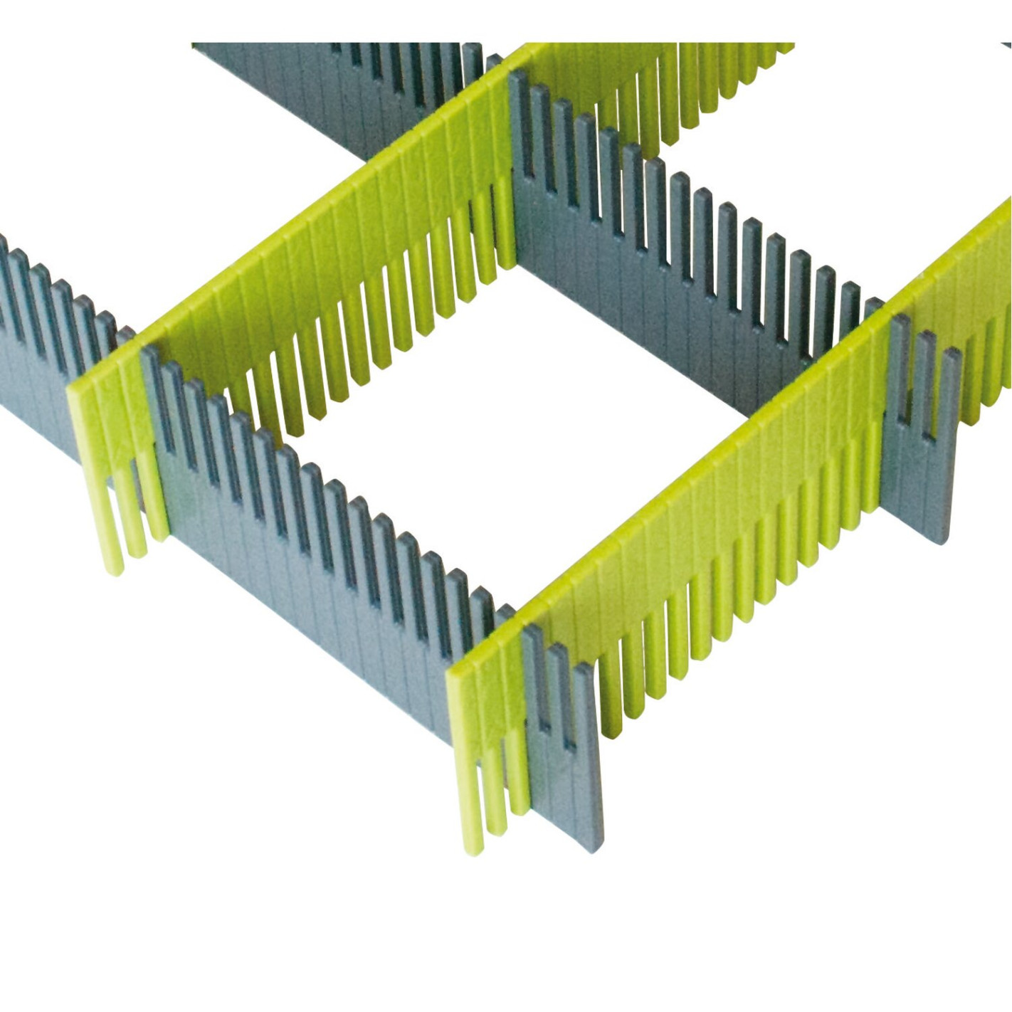 4 séparateurs sont verts et les 4 autres sont gris afin de mieux différencier ceux en dessous de ceux au dessus. Ainsi, les espaces de rangement s'adaptent à vos tiroirs, placards et frigo. Pour le modèle pour frigo, les séparateurs peuvent se clipser sur les grilles du réfrigérateur. Malin !