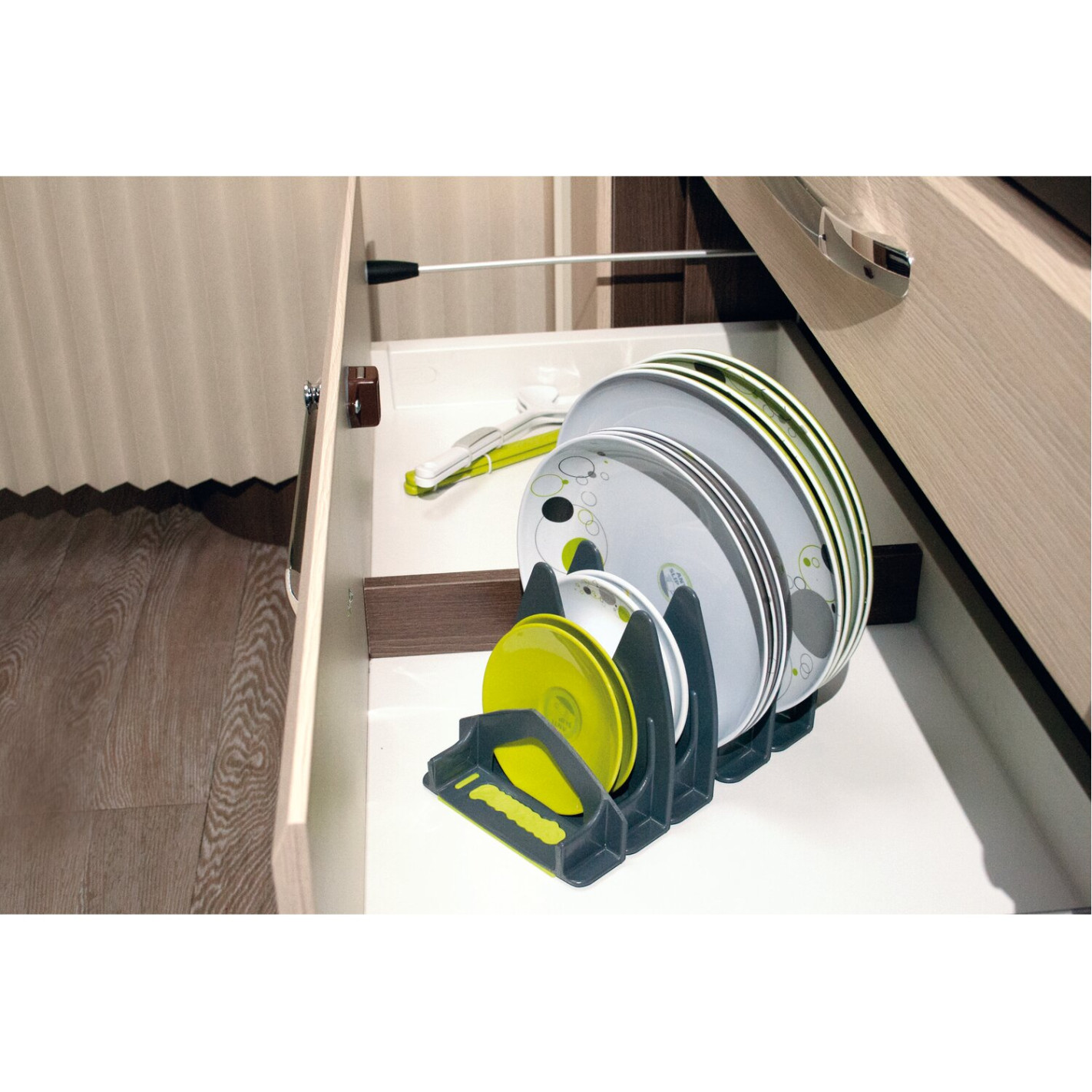Le range-assiette peut être utilisé, comme son nom l'indique, pour ranger des assiettes, mais aussi comme un égouttoir. De plus, il ne se limite pas à des assiettes ! Il s'adapte à tout type de vaisselle : assiettes (toute taille), plats, planches à découper, dessous de plat etc... Le porte-assiettes constitue une solution de rangement bien pratique dans votre véhicule de loisir (camping-car, caravane, van, fourgon, bateau...). Vous pouvez l'installer sur un plan de travail, dans un placard ou encore un tiroir.