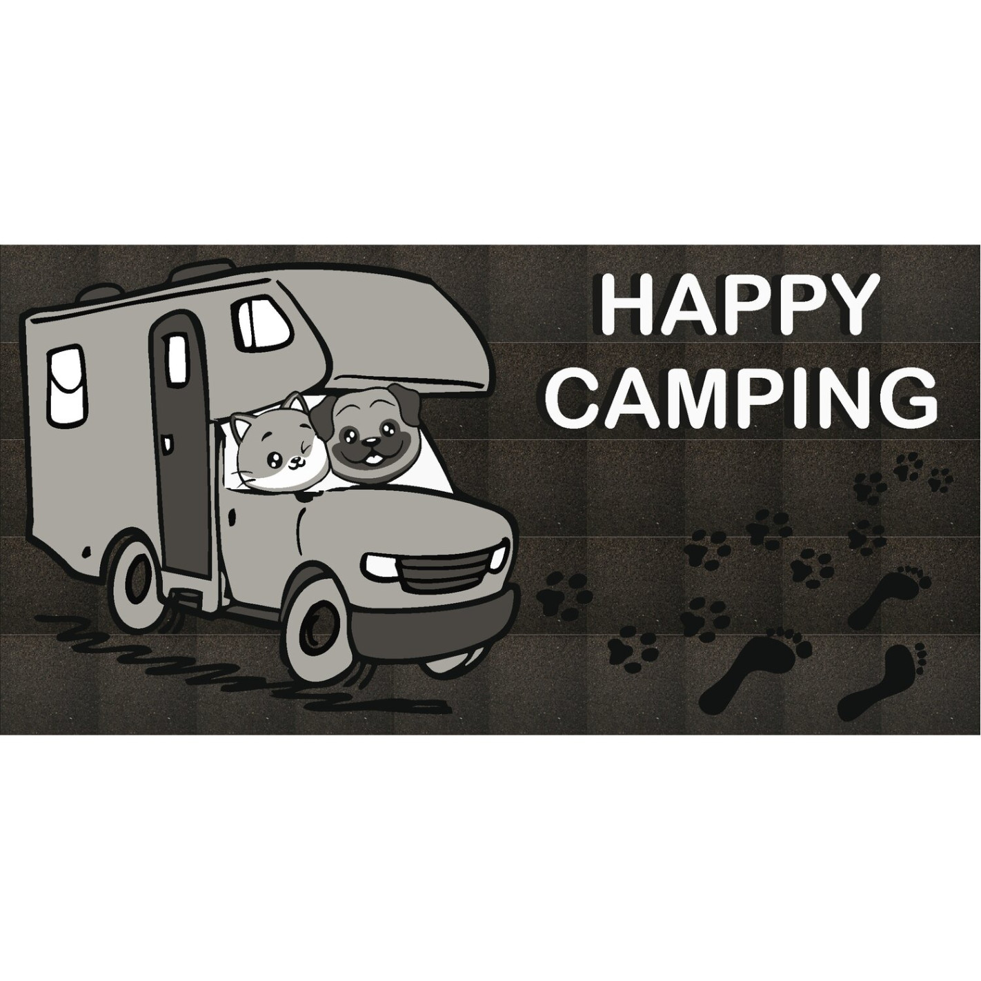 Le tapis d'intérieur avec motif Happy Camping en caoutchouc recyclé est parfait pour les véhicules de loisirs.