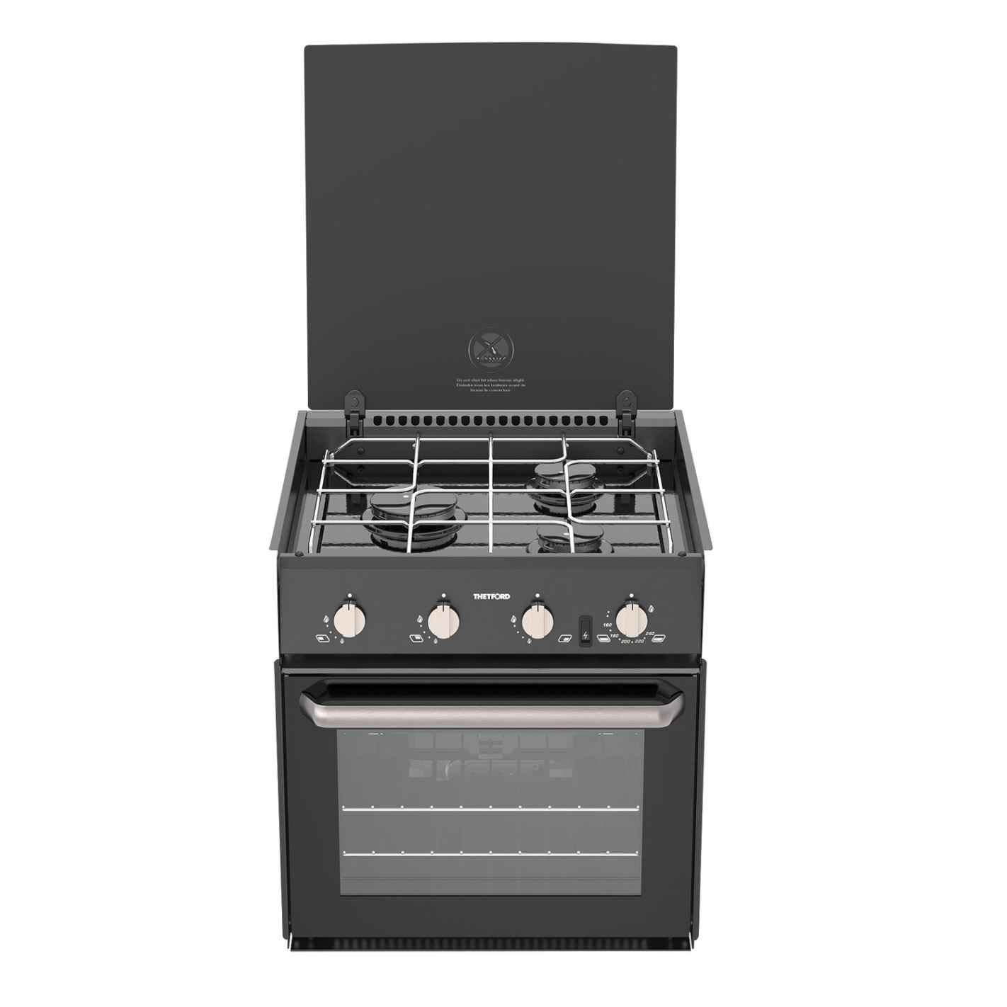 La gazinière Triplex Thetford allie robustesse et élégance. Les boutons de commande à effet métallique, la poignée de porte en nickel brossé et la porte en verre noir lui confèrent un design moderne, qui s’intègre parfaitement dans l’intérieur de tout véhicule de loisirs. Cette gazinière est également facile à nettoyer.