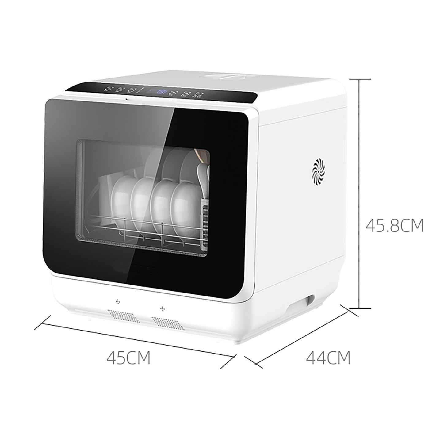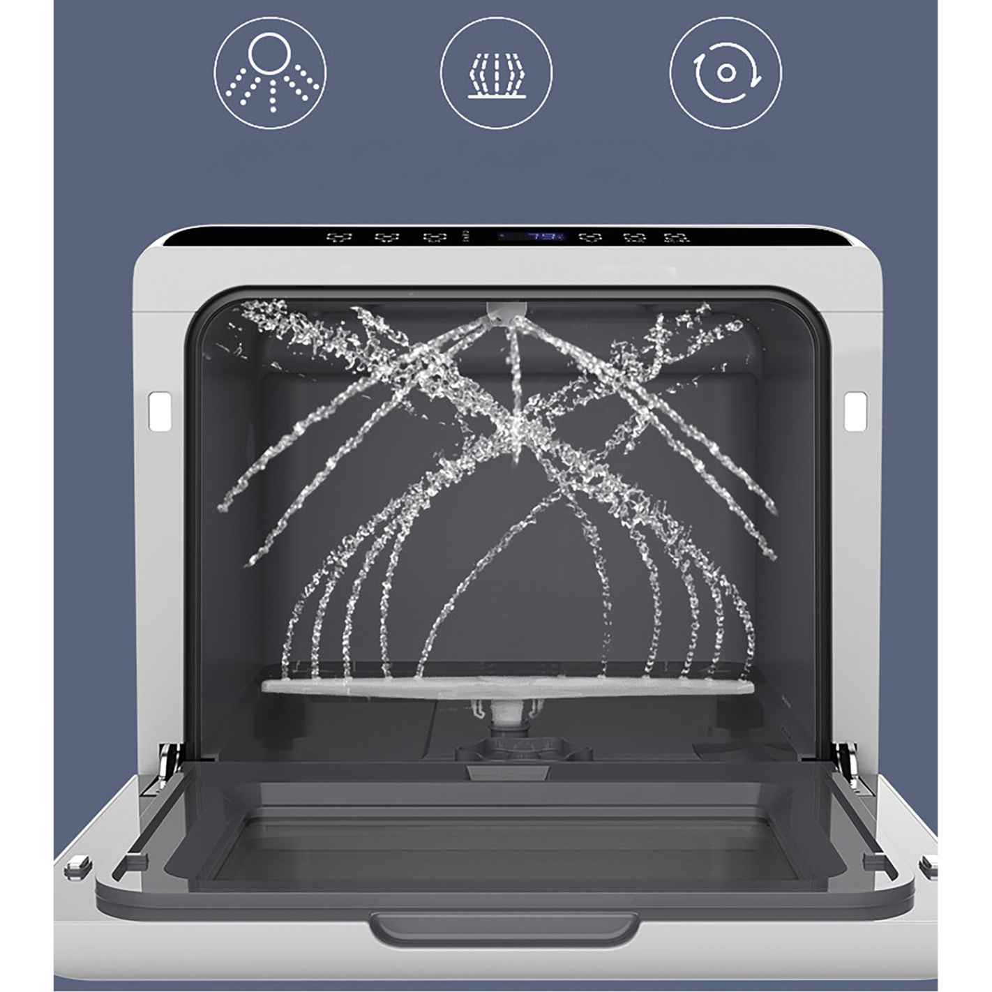 Mini lave-vaisselle Incasa au format compact, conçu pour laver la vaisselle ainsi que les fruits et légumes. Il s’installe facilement avec remplissage manuel du réservoir ou raccordement au robinet, propose 6 programmes (dont Fruits et Séchage), un départ différé jusqu’à 12 h et un système de double pulvérisation avec arrêt automatique à l’ouverture de la porte