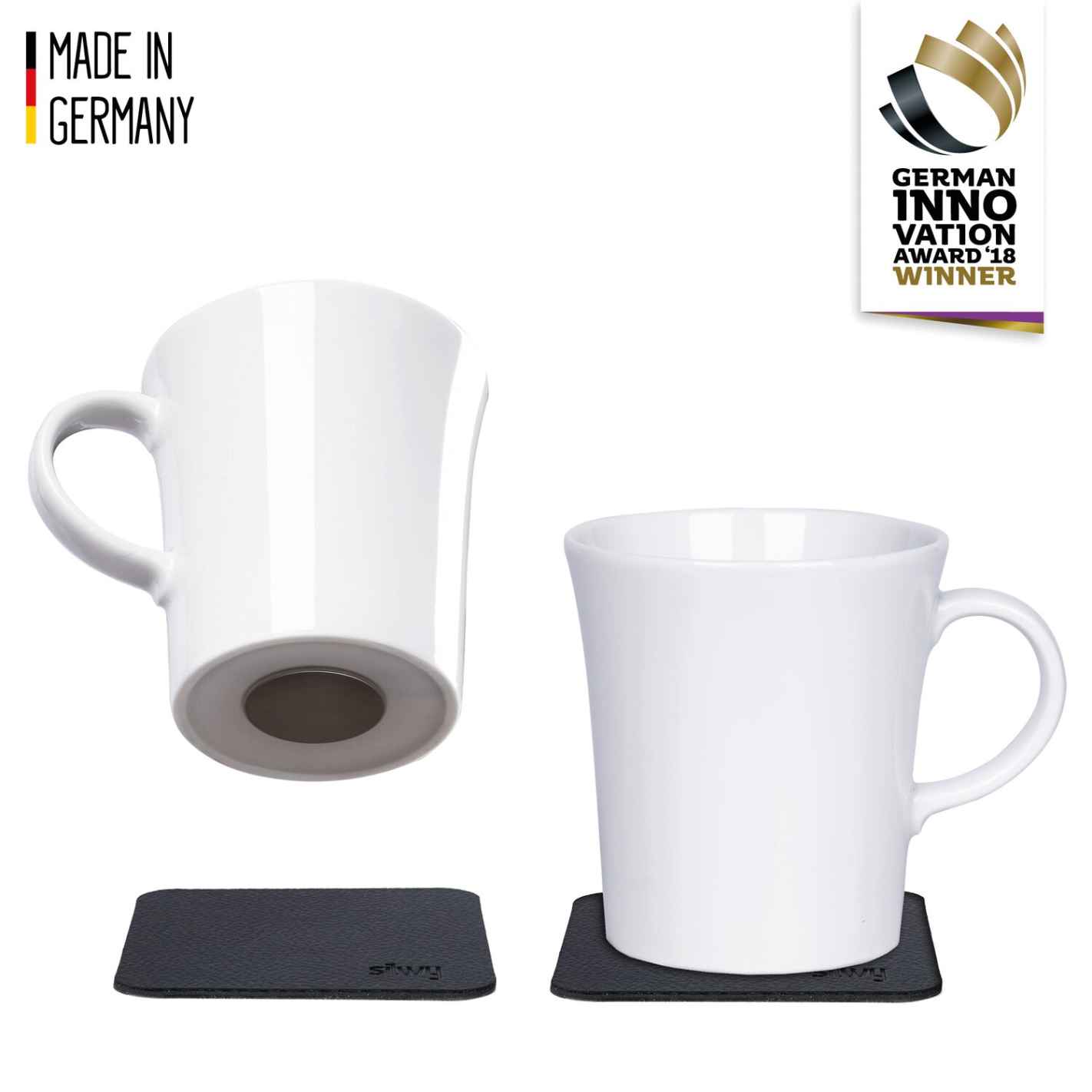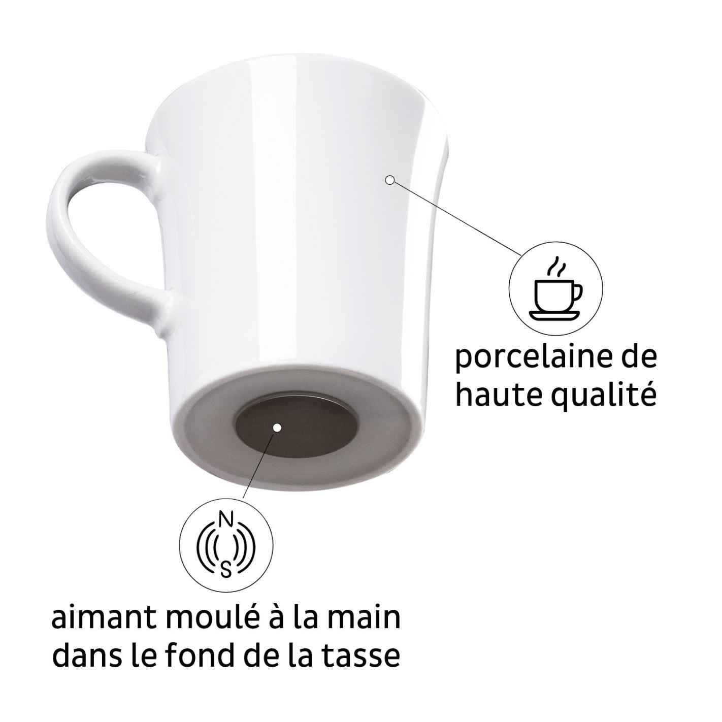 Un aimant est moulé dans le fond de la tasse. Une fois la tasse mise sur le pad (coussin), elle ne risque plus de bouger. Il devient impossible de la faire tomber. Pratique !