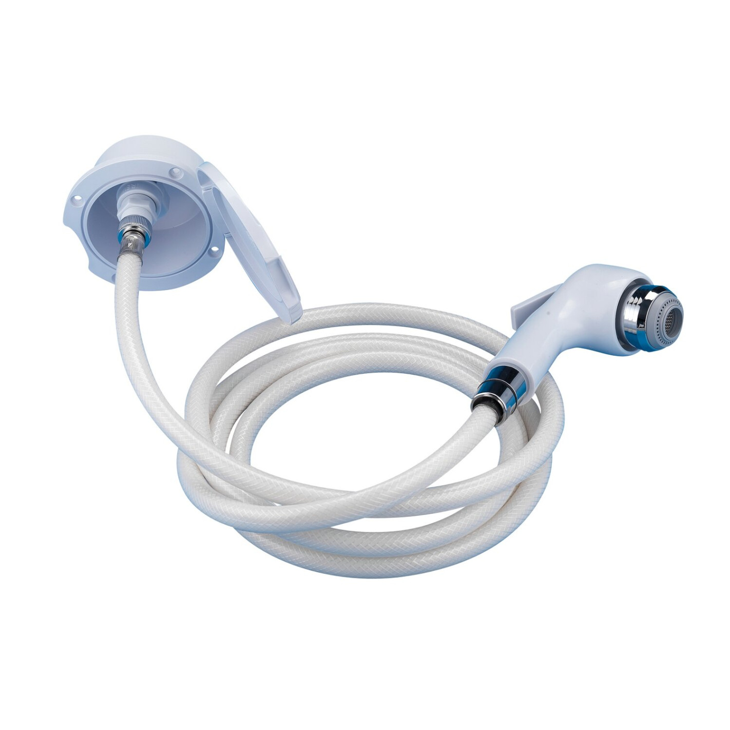 Douchette extérieure encastrable. Cet ensemble vous permet d'installer une douchette extérieure sur votre véhicule de losirs. L'ensemble est composé d'une douchette extérieure, d'un flexible de 2,5 mètres, du raccord sur socle encastrable (diamètre 70 mm).