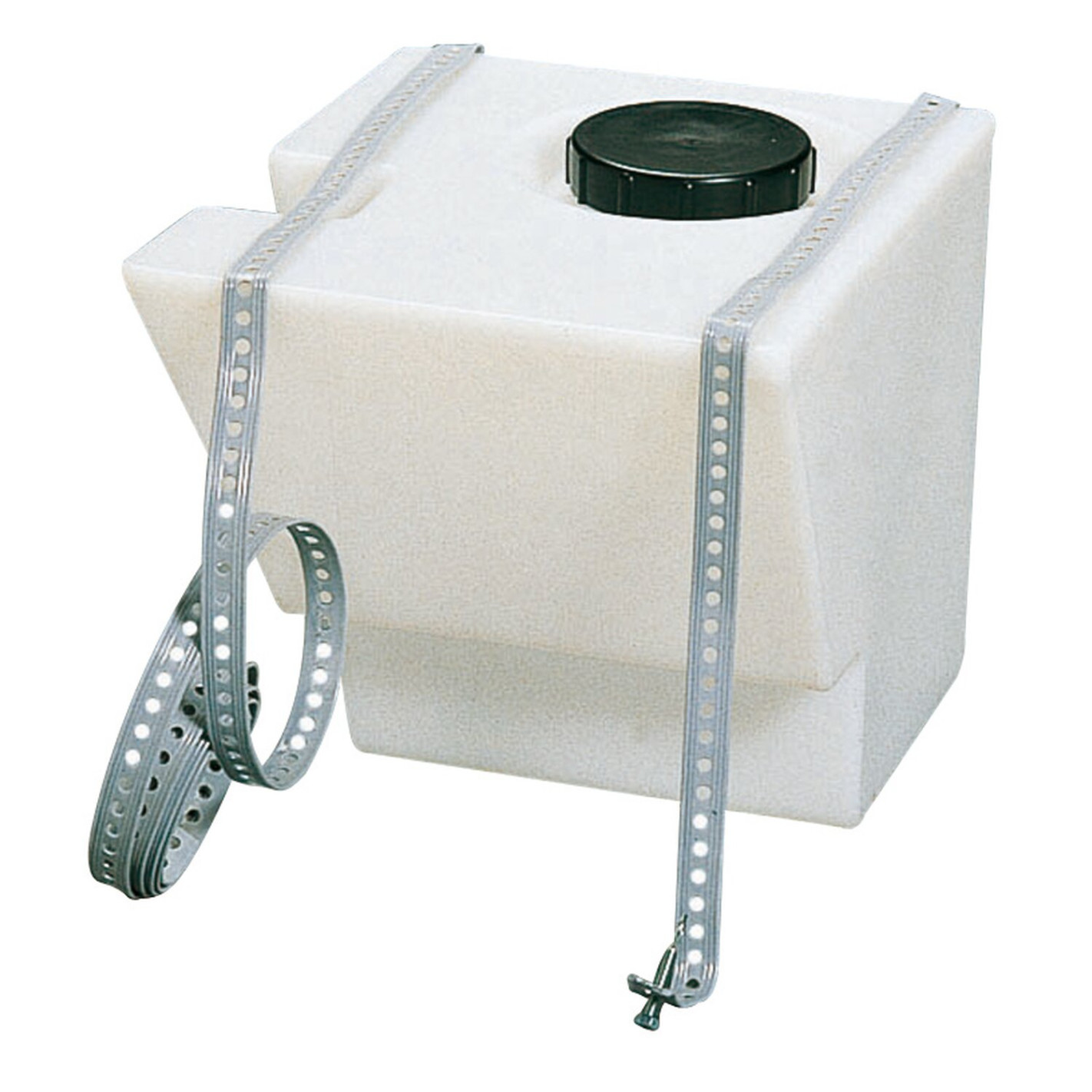 Sangle de fixation pour réservoir de camping-car. La sangle se compose d’une de métal zingué recouverte de plastique et percée tous les 15 mm pour un réglage précis de la tension.