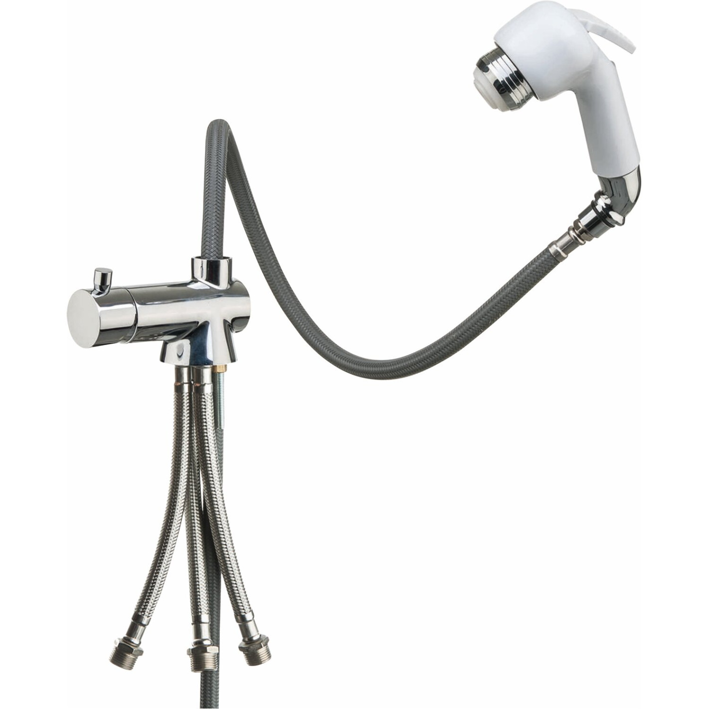 Accessoires fournis : kit de fixation avec visserie, 3 petits flexibles sotie mâle 12/17, 1 flexible 1,5m, 1 douchette, 1 raccord douchette.