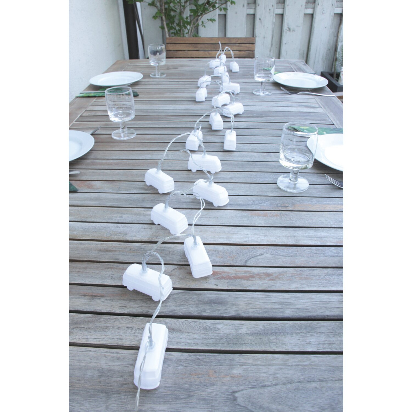 La guirlande T1 Bus, comme son nom l'indique, est composée de 20 mini bus VW T1. Ces mini bus s'illuminent de 4 couleurs différentes : bleu, rouge, jaune et vert. La guirlande est parfaite pour une ambiance rétro festive ! Ce sont des petites ampoules LED cachées sous les mini bus en matière synthétique blanche. Il y a uniquement un mode d'éclairage.