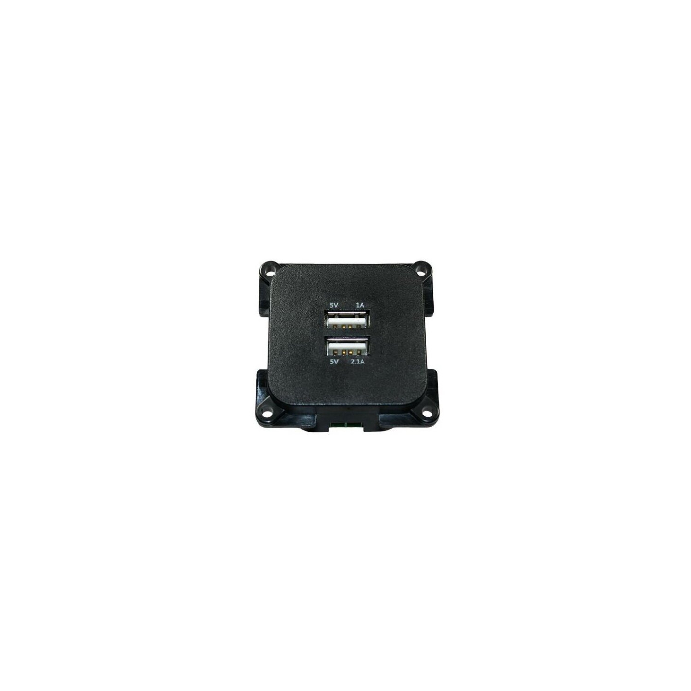 Alimentation: 12V. Sorties : 1 ports USB 5 Volts 2,1A + 1 ports USB 5 Volts 1A. Dimensions hors-tout : 52 x 52 mm. Entraxe : 46x46 mm.