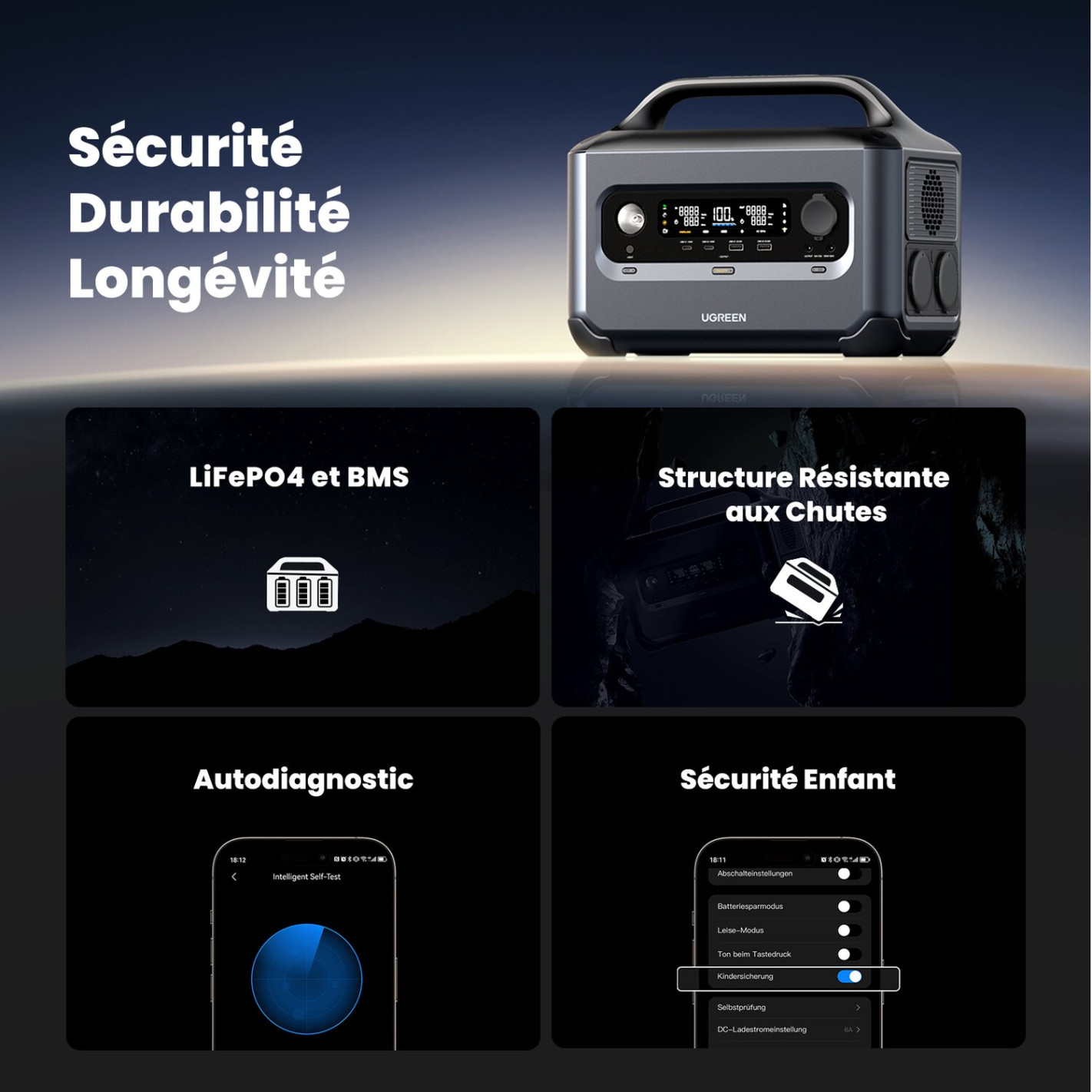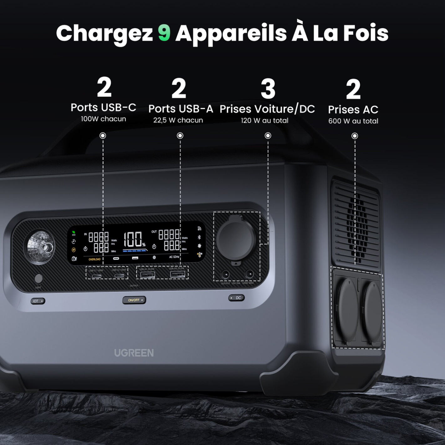 - Application mobile (Bluetooh ou Wifi) : avec l'application UGREEN simple et complète, surveillez votre power station n'importe où, y compris de nombreuses fonctions pratiques telles que le mode silencieux, le mode d'économie d'énergie, la sécurité enfant, etc.