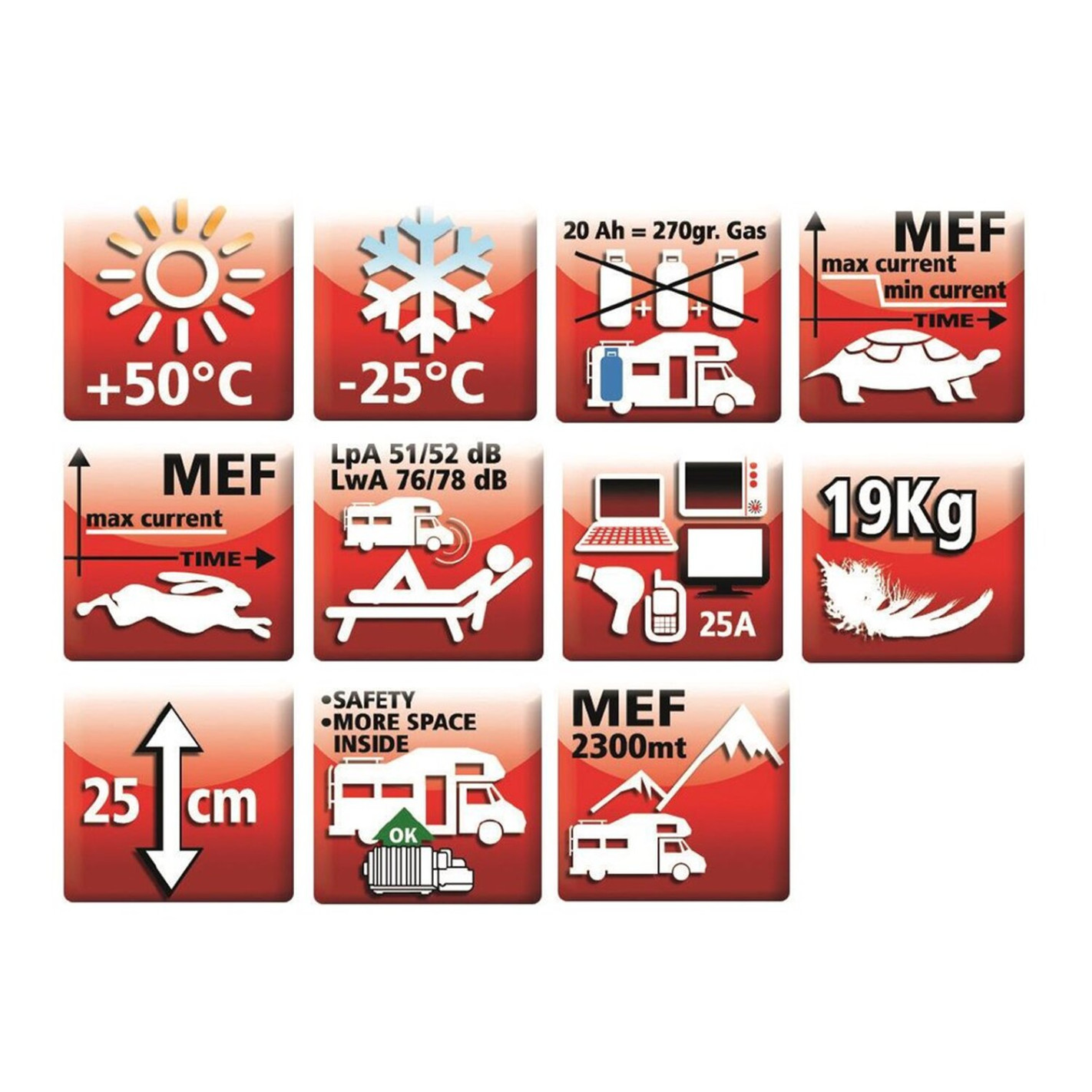 Conso. huile lubrifiante : 1 litre / 115 h. Pour raccorder l'Eco Energy au circuit gaz du véhicule il est nécessaire de commander la lyre Réf. 452380. Courant nominal : 20 A / h. Conso. gaz : 0,27 kg / h. Niveau sonore : 51 dBA.