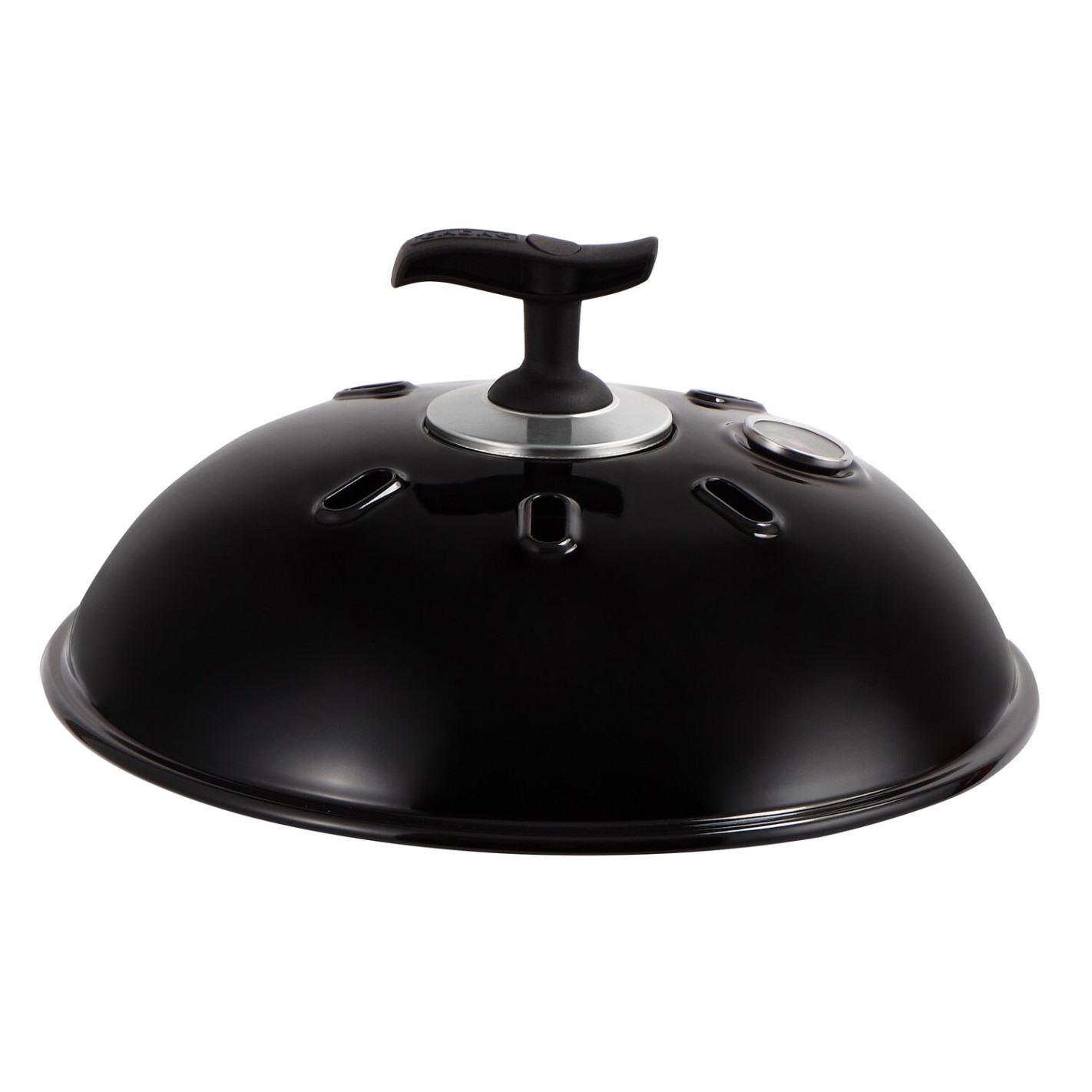 Grille BBQ avec revêtement antiadhésif en céramique (pas de téflon) diam. 38 cm. Support de casserole et couvercle émaillé vitrifié avec thermomètre intégré (peut être accroché sur le côté du BBQ pour faire office de pare-vent). Bac de récupération des graisses émaillé vitrifié amovible. Bouton poussoir avec allumage piezo et valve de contrôle du gaz. Pieds en caoutchouc pour plus de stabilité.