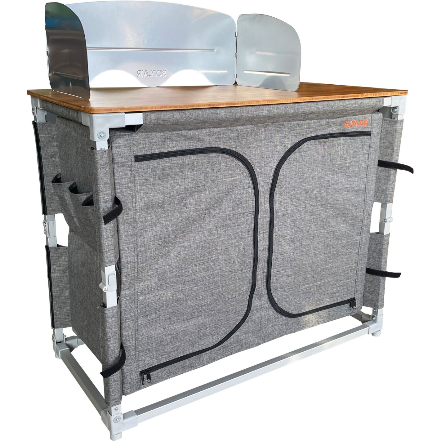 Le plan de travail est en bambou : un matériau de qualité facile à nettoyer et écologique. Lorsque vous montez le meuble de camping Easyquick Java, le pare flamme en aluminium se place sur le plan de travail en bambou.Un meuble pour camping à l'aspect design !