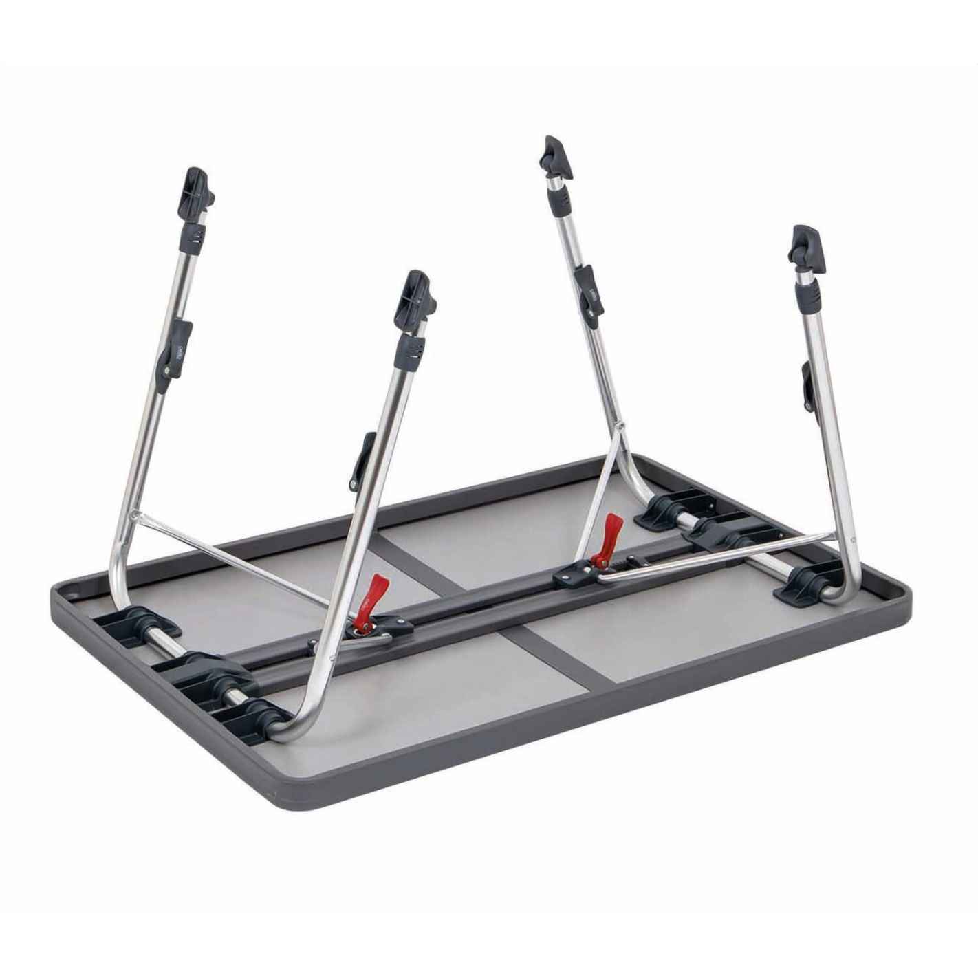 La table en alu Crespo est une table pliante. Légère et compacte une fois pliée (avec une hauteur de 4 cm environ), elle se transporte facilement. Elle peut donc vous accompagner dans toutes vos aventures !
