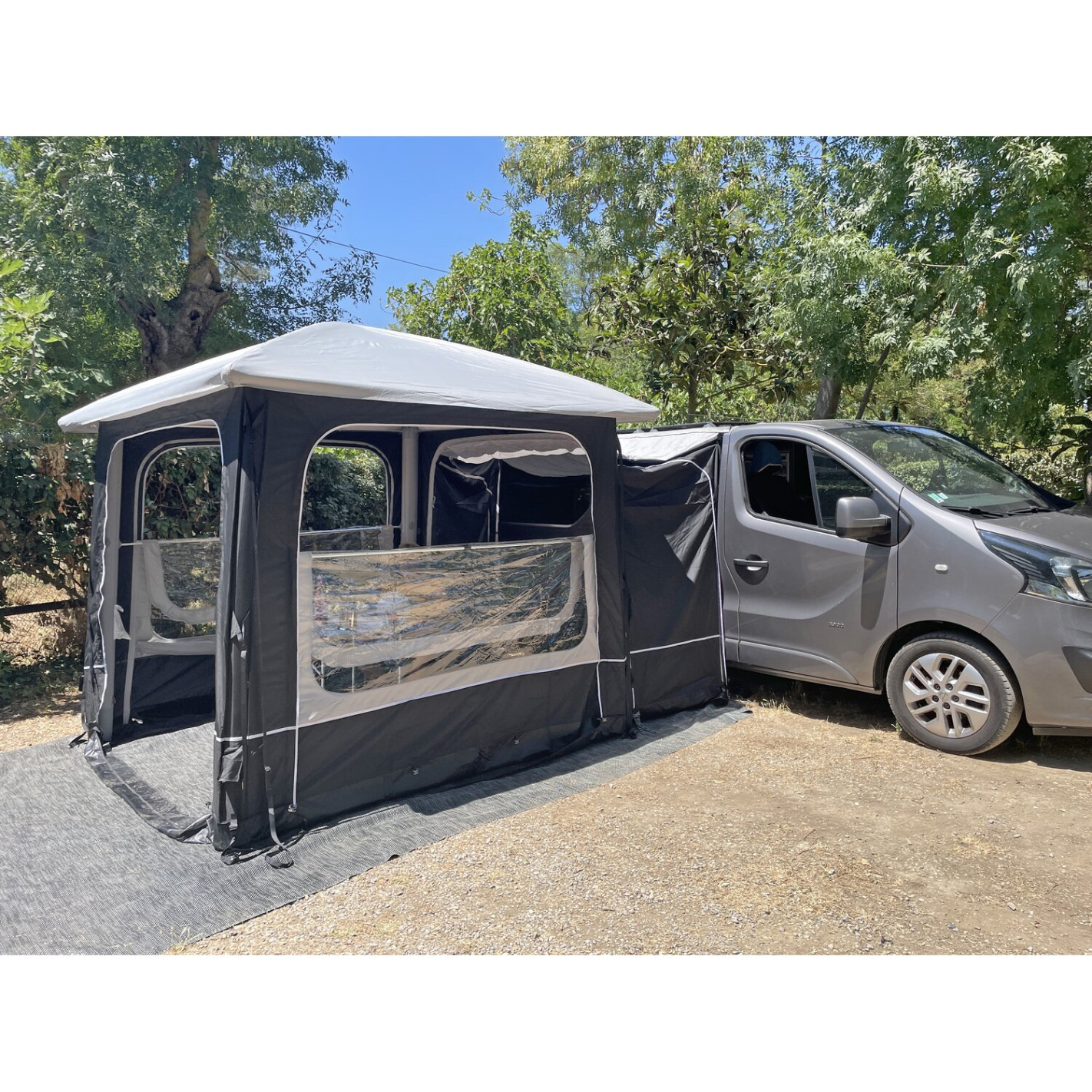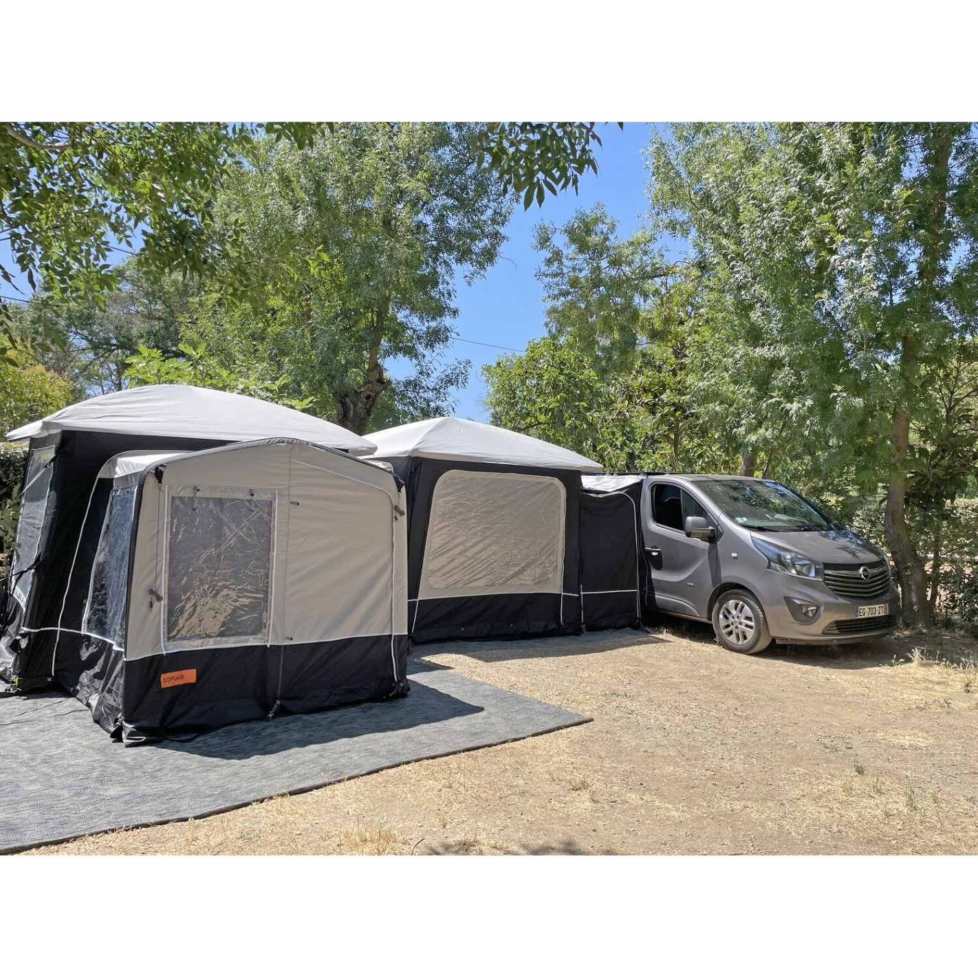 Le tunnel de connexion latéral pour l'abri Lodge Air de Soplair, équipé d'une glissière et d'un double jonc, permet un raccordement facile à votre véhicule tout en offrant des portes d'accès supplémentaires et un espace additionnel pratique