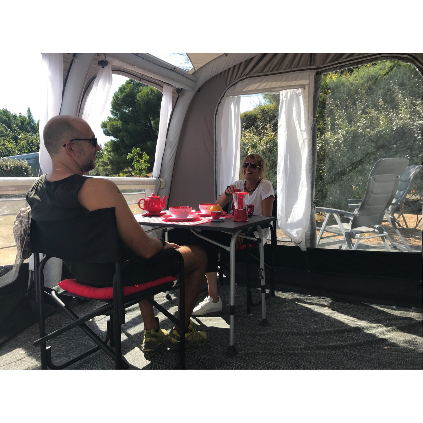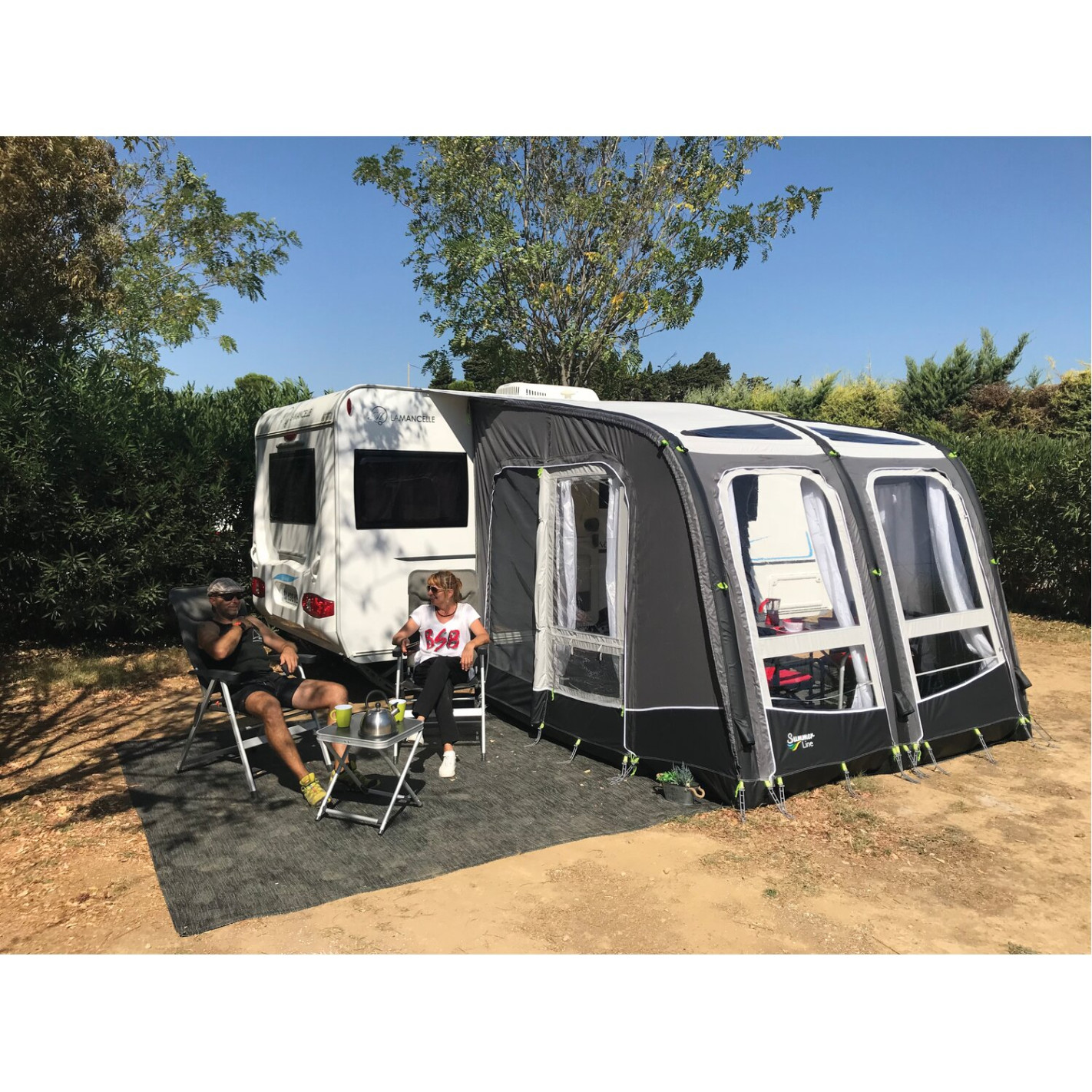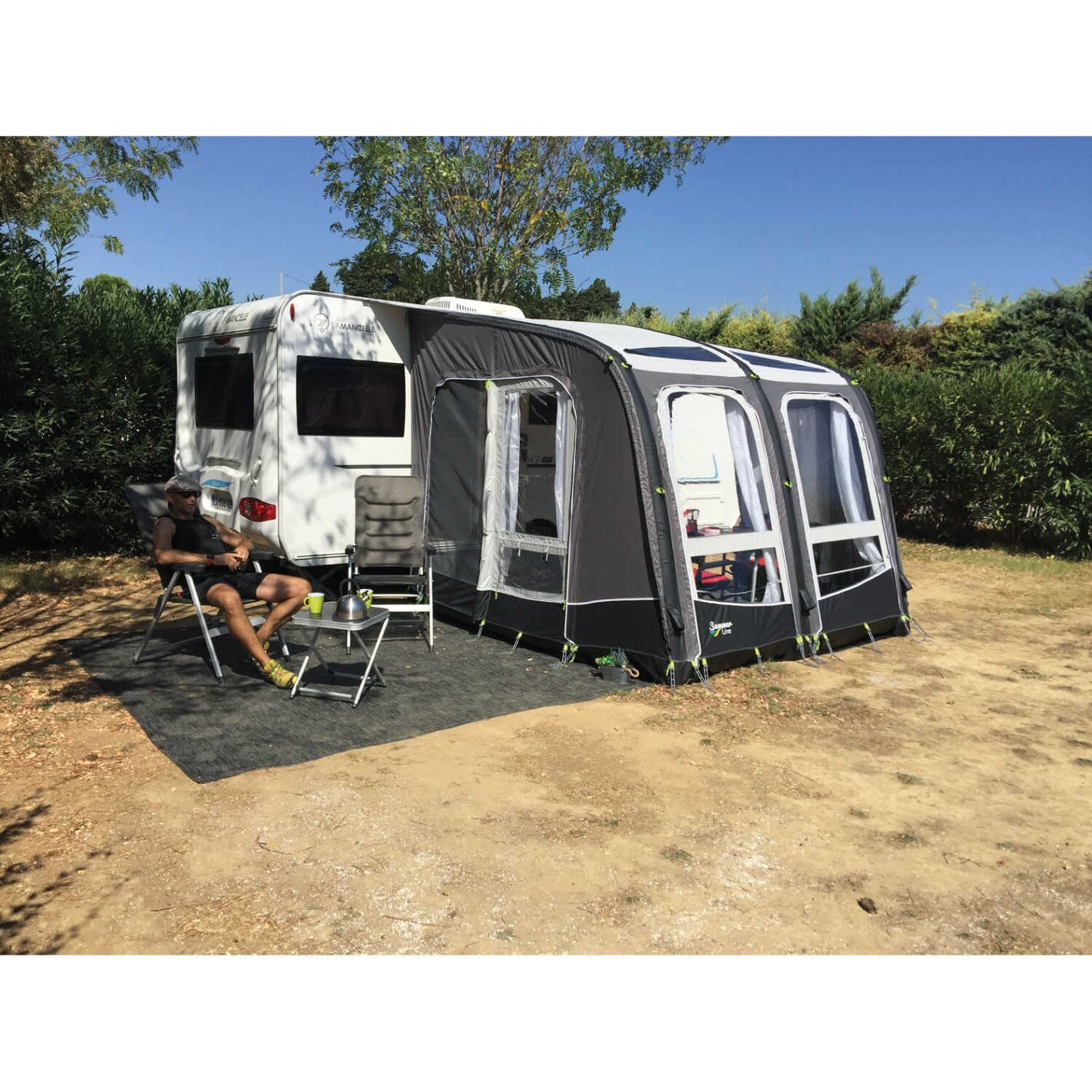 Auvent Libeccio Air Plus gonflable Summerline pour caravane. Cet auvent gonflable pour caravane permet un gonflage en un seul point grâce à ses arceaux reliés entre eux ce qui facilite grandement le montage et le démontage. Vous pourrez augmenter aisément la taille de votre espace de vie, un grand auvent même si vous avez une caravane de petite taille, grâce aux extensions gauches et droites en option. L'auvent Libeccio Air Plus sera robuste et facile d'entretien grâce à sa toile en polyester de qualité supérieure. L'auvent Libeccio Air Plus est également modulable : Façade et côtés détachables, panneaux lumineux au toit.