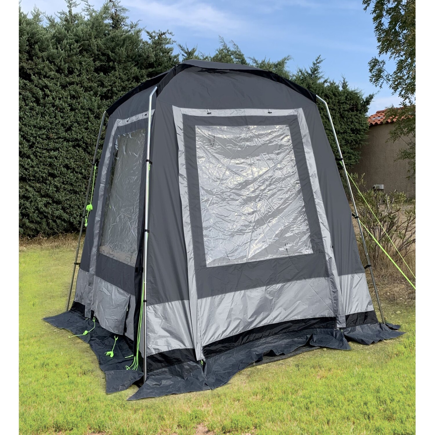 Dim. de l'auvent : 235 x 235 cm. Longueur du tunnel de raccordement : 135 cm. Armature fibre de verre + acier. Poids : 14kg.