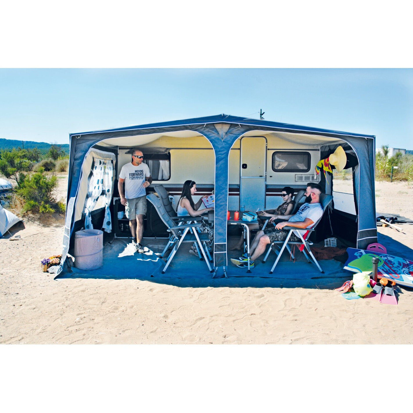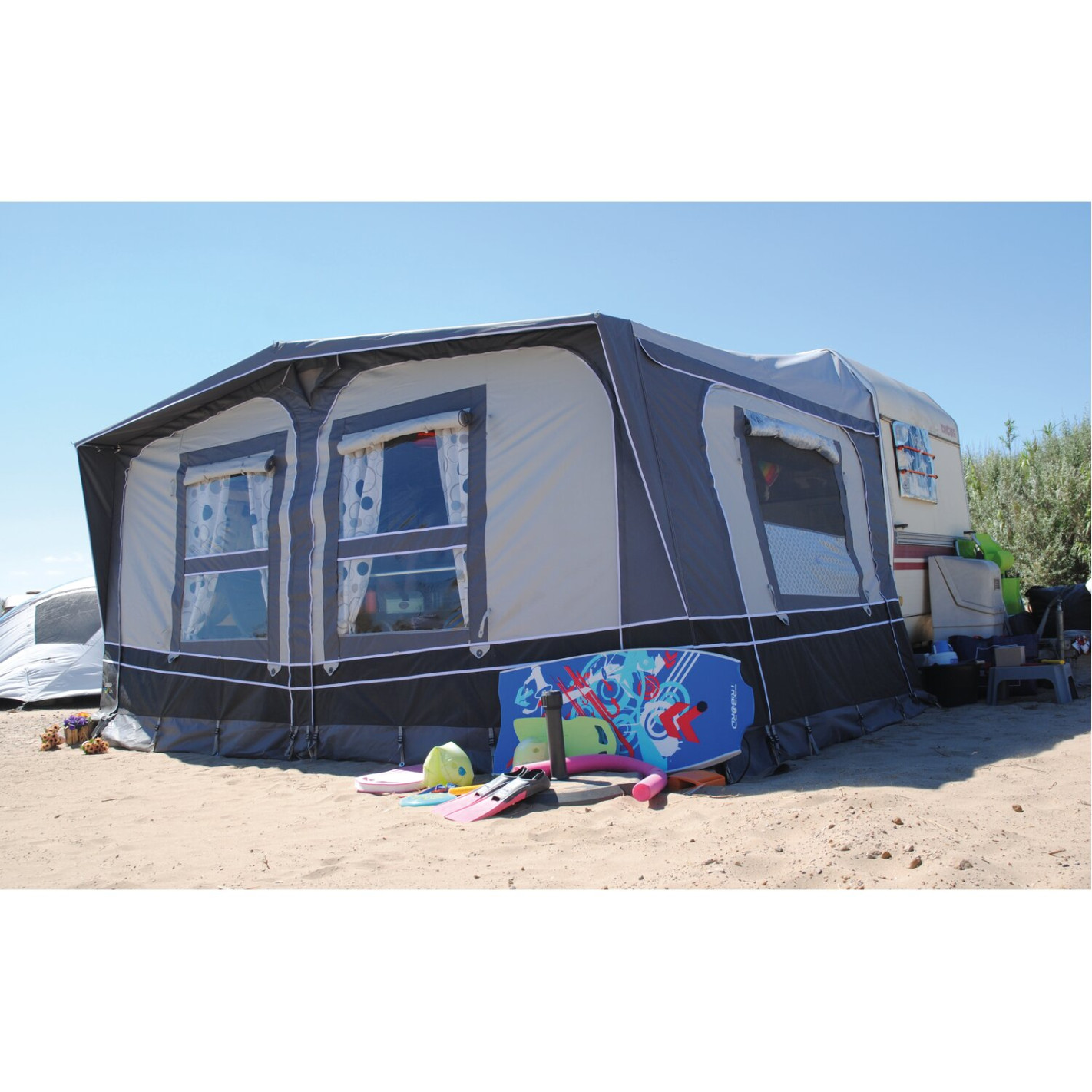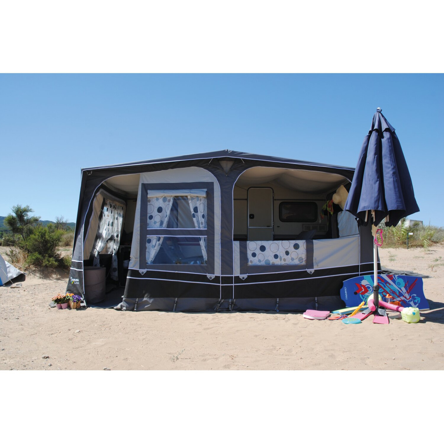Auvent PVC ZIRCON Summerline pour caravane. toile PVC 4 saisons : robuste et facile d'entretien idéal pour les longs séjours. Façade détachable en 2 parties. Aération par moustiquaire réglable par fermeture à glissières. 2 portes. 2 grandes fenêtres en PVC cristal. Toit : toile PVC enduite double face 560 g/m2. Façade et murs : toile PVC enduite double face 470 g/m2. Bas enduit : PVC 470 g/m2. Bavette intérieure : PVC 350 g/m2. Casquette armaturée . Livré avec vélum. Pour en savoir plus sur les options, contactez-nous. Profondeur 270 taille 12. Pour développé compris entre 10,86 à 11,20