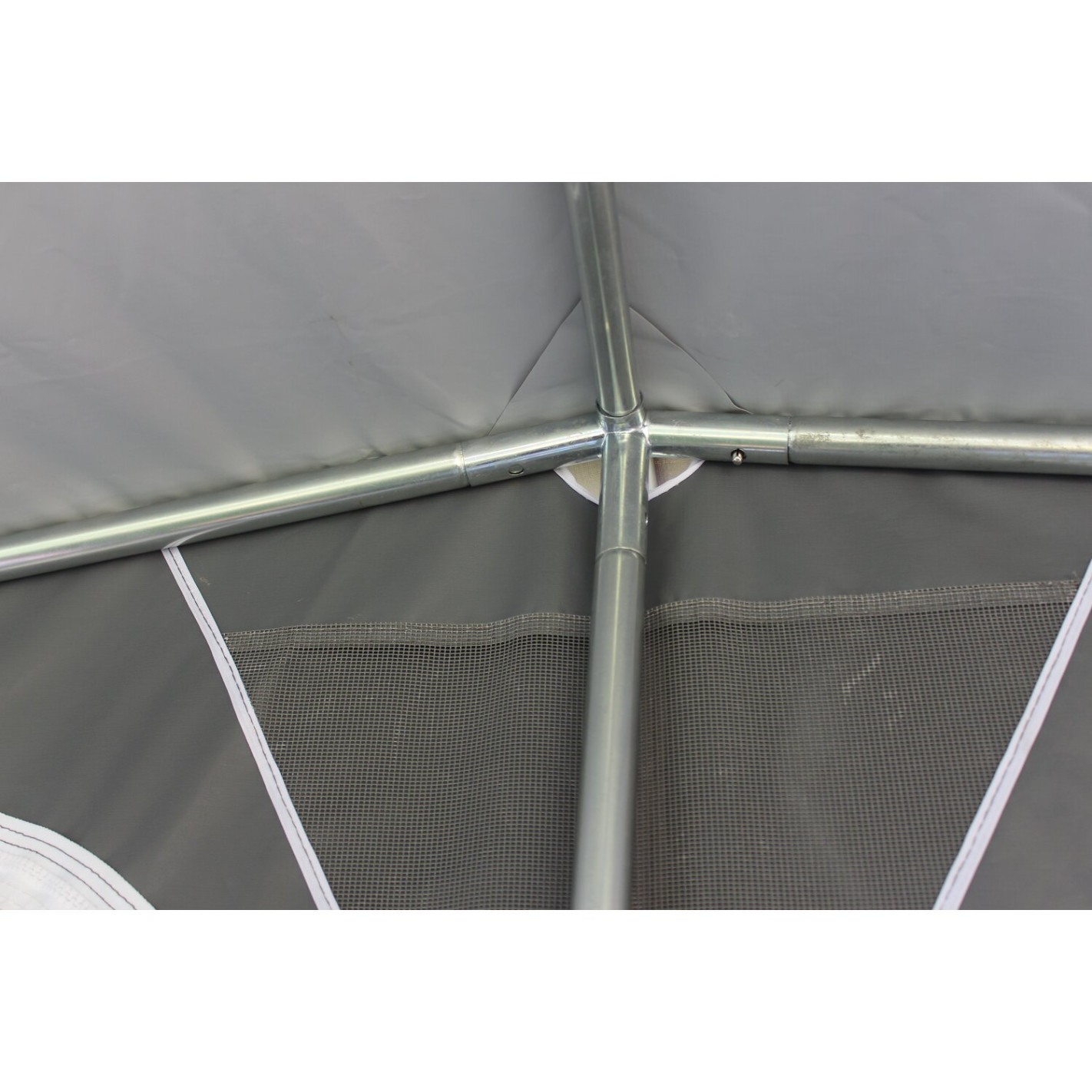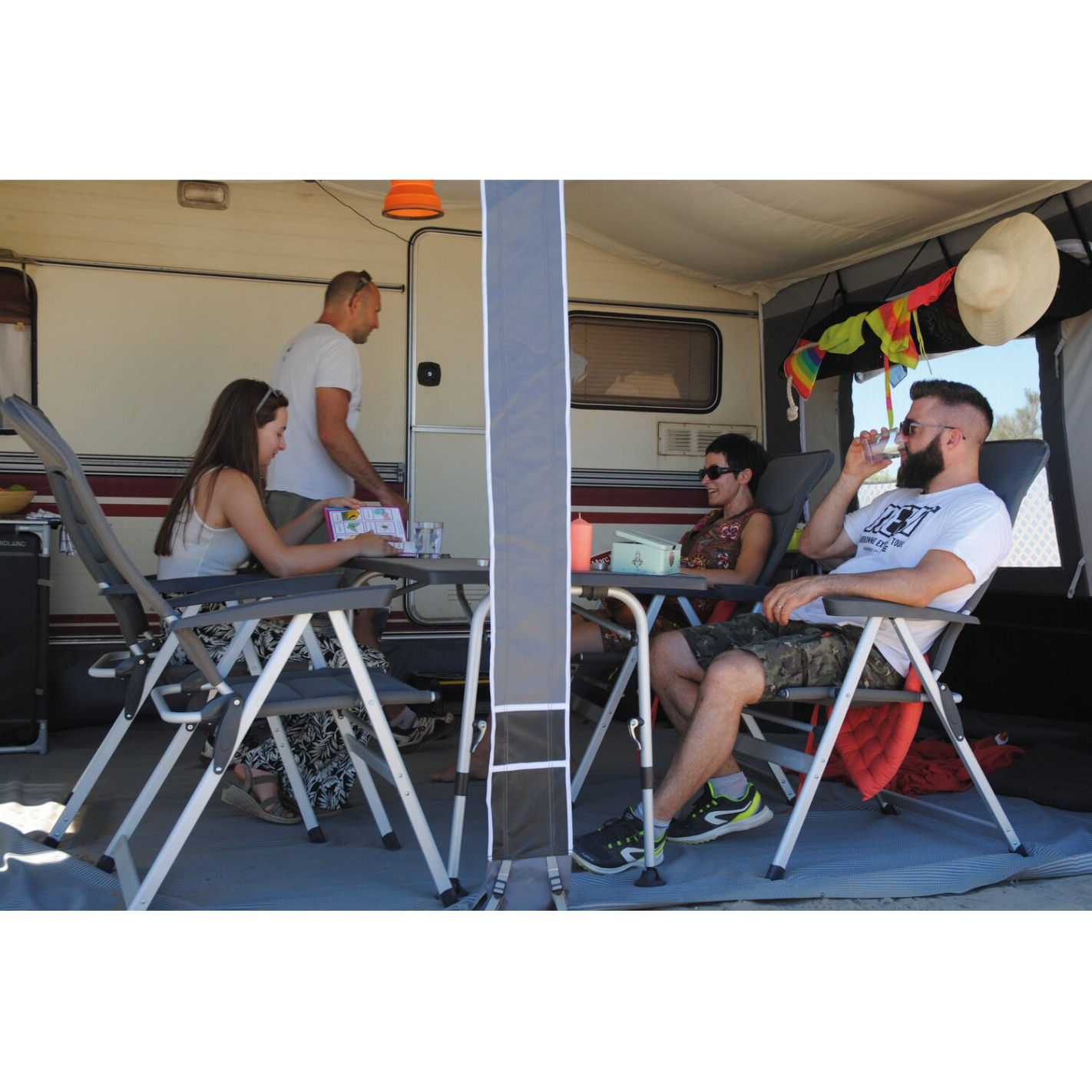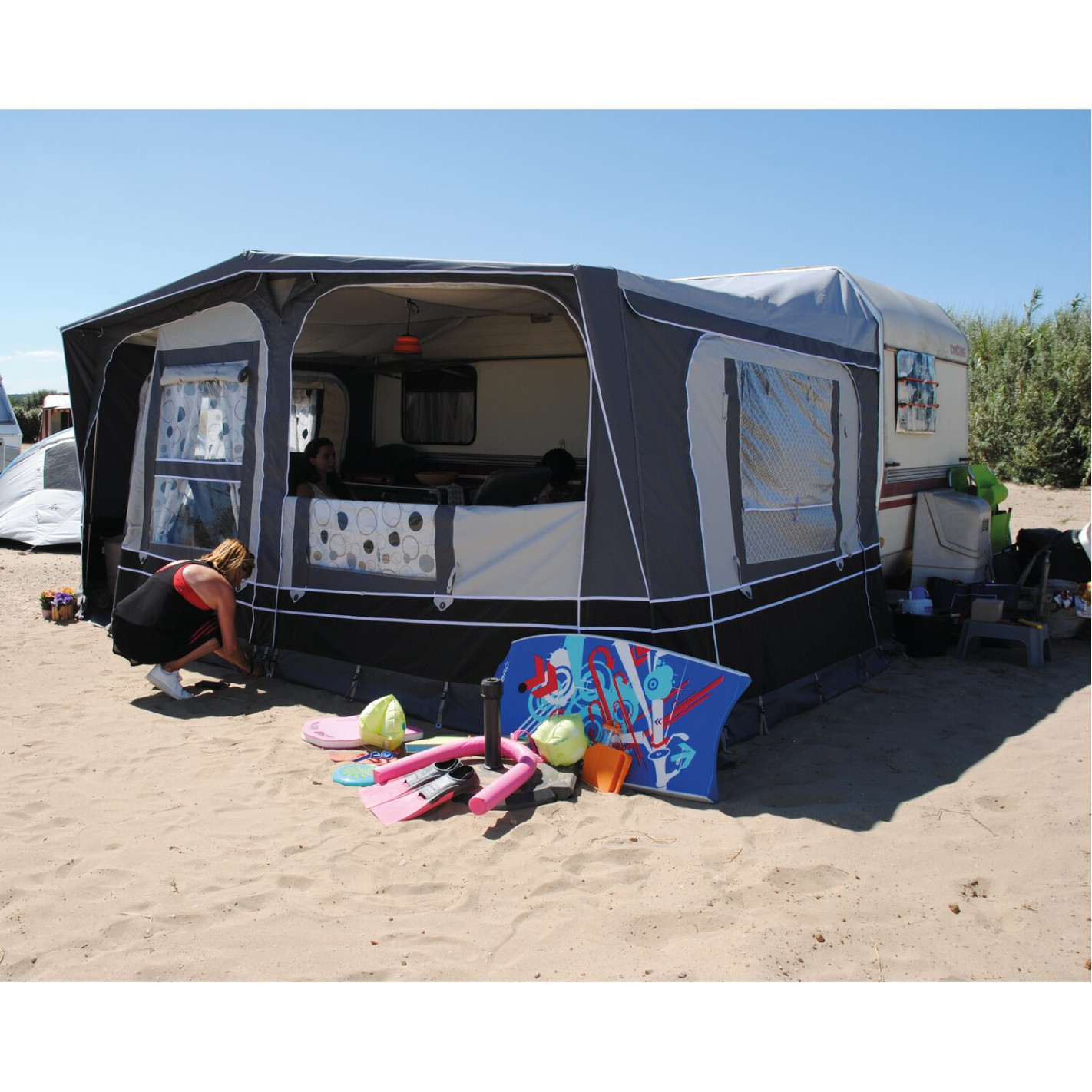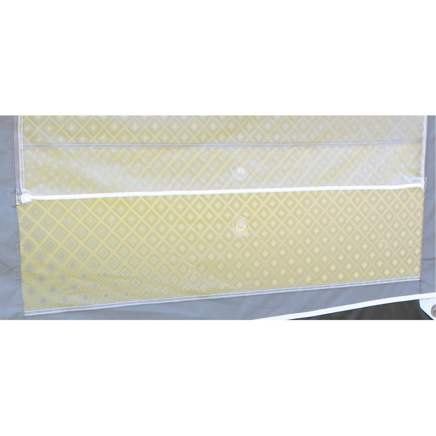 Auvent PVC ZIRCON Summerline pour caravane. toile PVC 4 saisons : robuste et facile d'entretien idéal pour les longs séjours. Façade détachable en 2 parties. Aération par moustiquaire réglable par fermeture à glissières. 2 portes. 2 grandes fenêtres en PVC cristal. Toit : toile PVC enduite double face 560 g/m2. Façade et murs : toile PVC enduite double face 470 g/m2. Bas enduit : PVC 470 g/m2. Bavette intérieure : PVC 350 g/m2. Casquette armaturée . Livré avec vélum. Pour en savoir plus sur les options, contactez-nous. Profondeur 270 taille 12. Pour développé compris entre 10,86 à 11,20