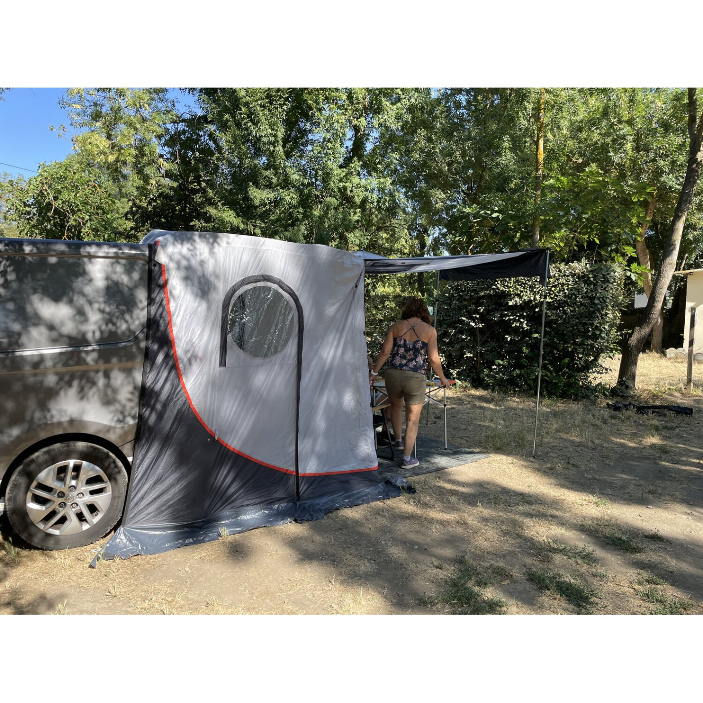 Ce sas offre une extension fonctionnelle, utilisable selon les besoins : espace de stockage, zone pour se changer, petit coin repas ou couchage d’appoint. Il permet de bénéficier d’un abri discret et ventilé, tout en conservant une bonne protection contre les éléments extérieurs.