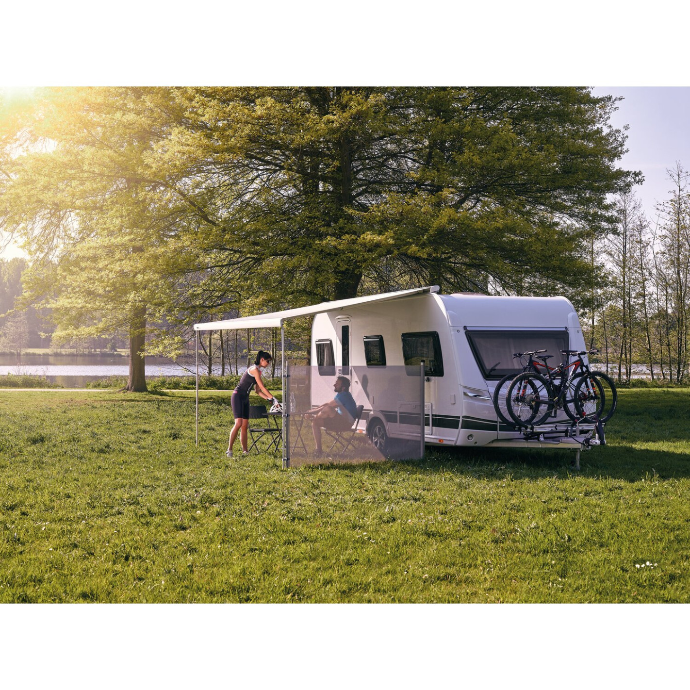 Le côté étirable protège du vent et vis-à-vis. L'installation est facile et rapide. Le premier mât se fixe à la paroi du véhicule grâce à l'étrier pour pieds de store et il se fixe au sol à l'aide de piquets. Le second mât se fixe sur le pied du store ou bien à l'aide d'une sardine et d'en tendeur fournis. L'objectif est d'étirer le côté à la longueur souhaitée.