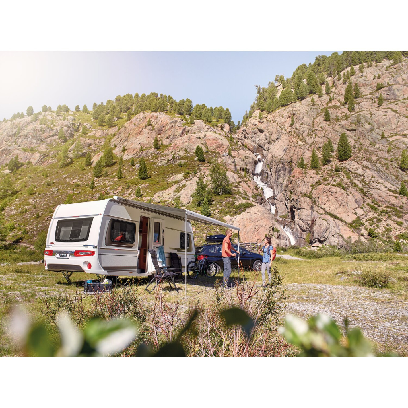 Le store 6300 Thule se monte sur le toit. Un montage sur le toit est plutôt avantageux pour les caravanes car elles peuvent laisser le rail libre pour une autre installation comme par exemple un auvent. Le système de blocage du store favorise un réglage des pieds intégrés. Il est également possible d'incliner le store afin de pouvoir ouvrir et fermer la porte coulissante du fourgon. Astucieux !