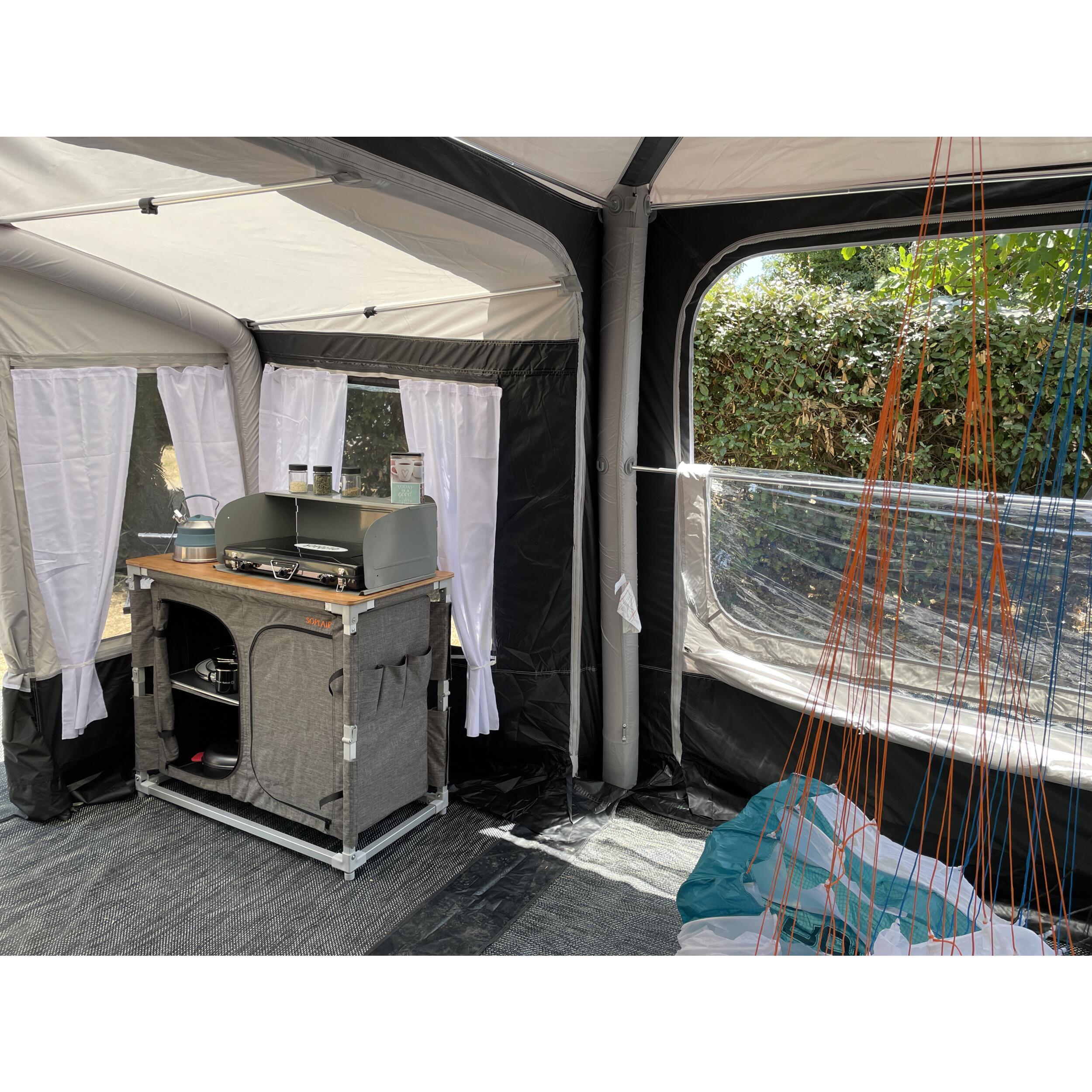 L'annexe cuisine pour l'abri Lodge Air de Soplair, dotée d'une structure gonflable et de nombreuses fenêtres, propose un espace de cuisine pratique, lumineux et simple à monter comme à transporter.