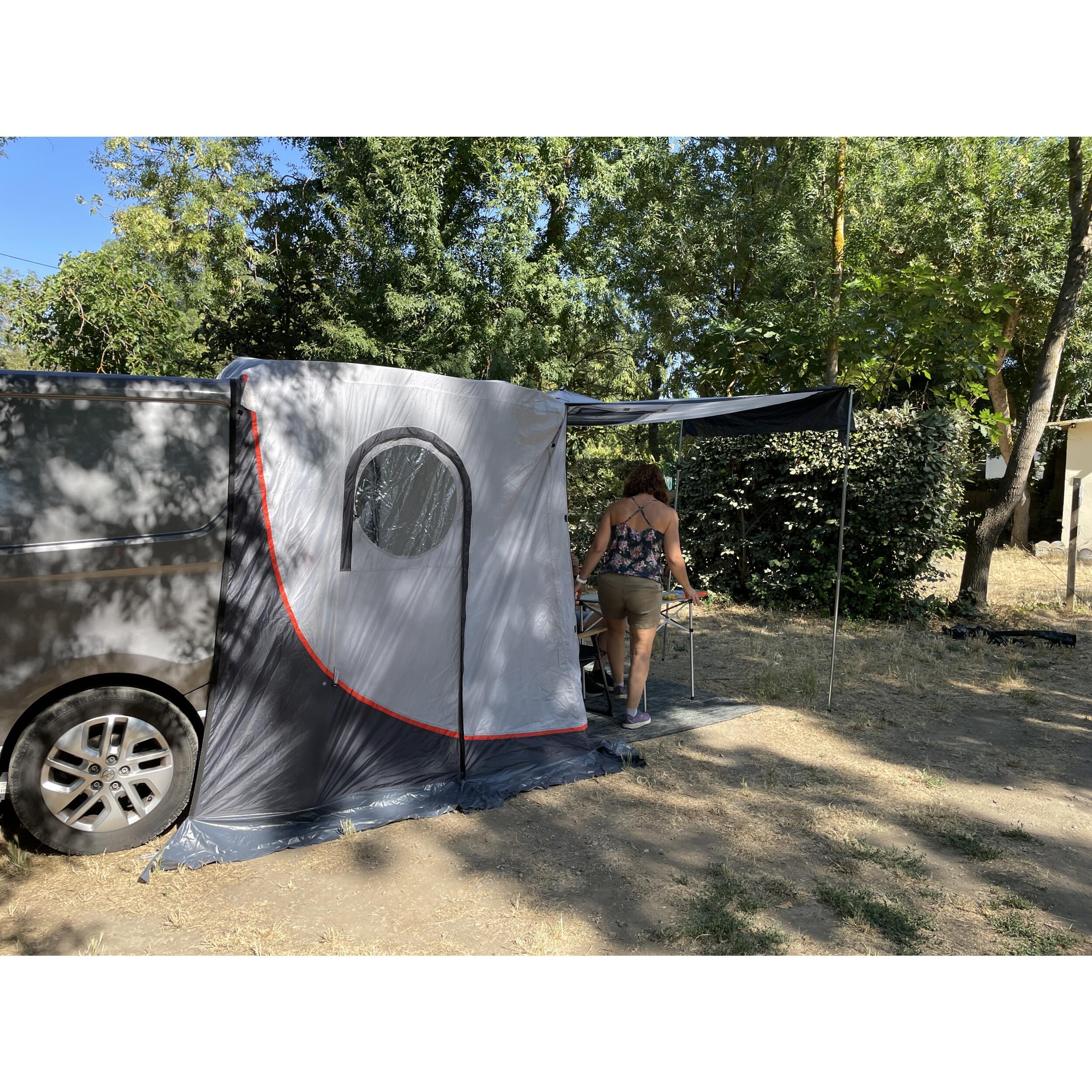 Ce sas offre une extension fonctionnelle, utilisable selon les besoins : espace de stockage, zone pour se changer, petit coin repas ou couchage d’appoint. Il permet de bénéficier d’un abri discret et ventilé, tout en conservant une bonne protection contre les éléments extérieurs.