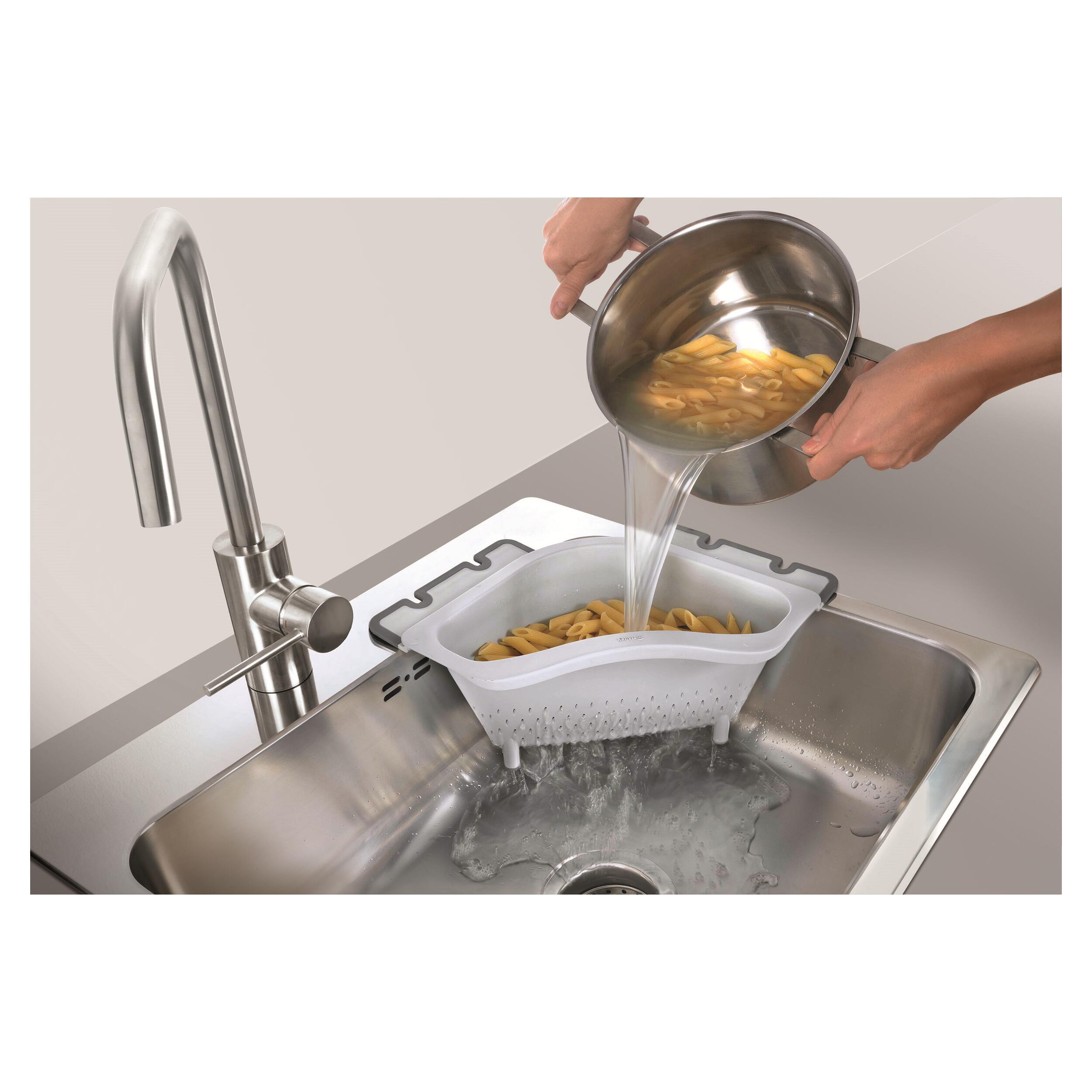La passoire d'angle est pratique pour égoutter des pâtes, laver des fruits et légumes ou encore égoutter des aliments. Le tout sans avoir à tenir la passoire !