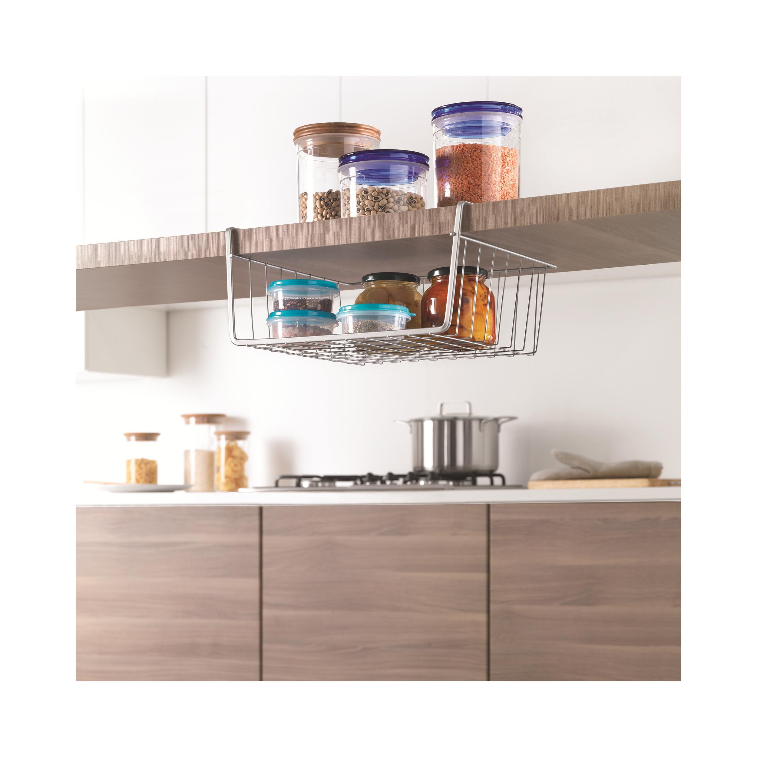 La corbeille est une petite étagère utile pour y stocker des boîtes alimentaires, des bocaux, conserves ou autres éléments de cuisine. Grâce à cette étagère, vous bénéficiez de rangement supplémentaire dans une cuisine et d'un temps précieux à ne plus avoir besoin de chercher.