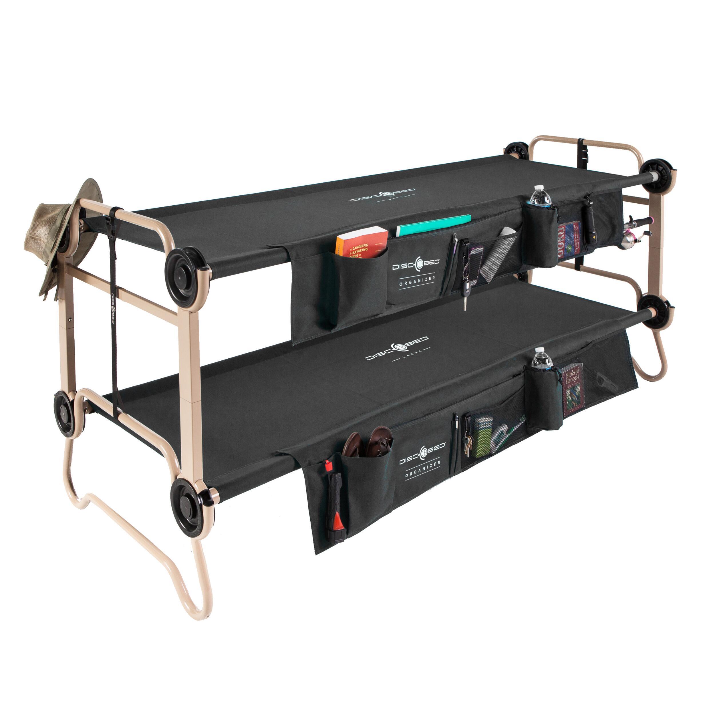 L'organiseur permet aux enfants de garder leurs affaires personnelles à portée de main lors de séjours en camping. Avec ses poches ouvertes et zippées, il offre un rangement optimisé pour divers objets (livres, jouets, lampes, etc.). Facile à fixer au lit Disc-O-Bed grâce à des bandes Velcro solides, il reste en place en toute sécurité, même pendant la nuit.
