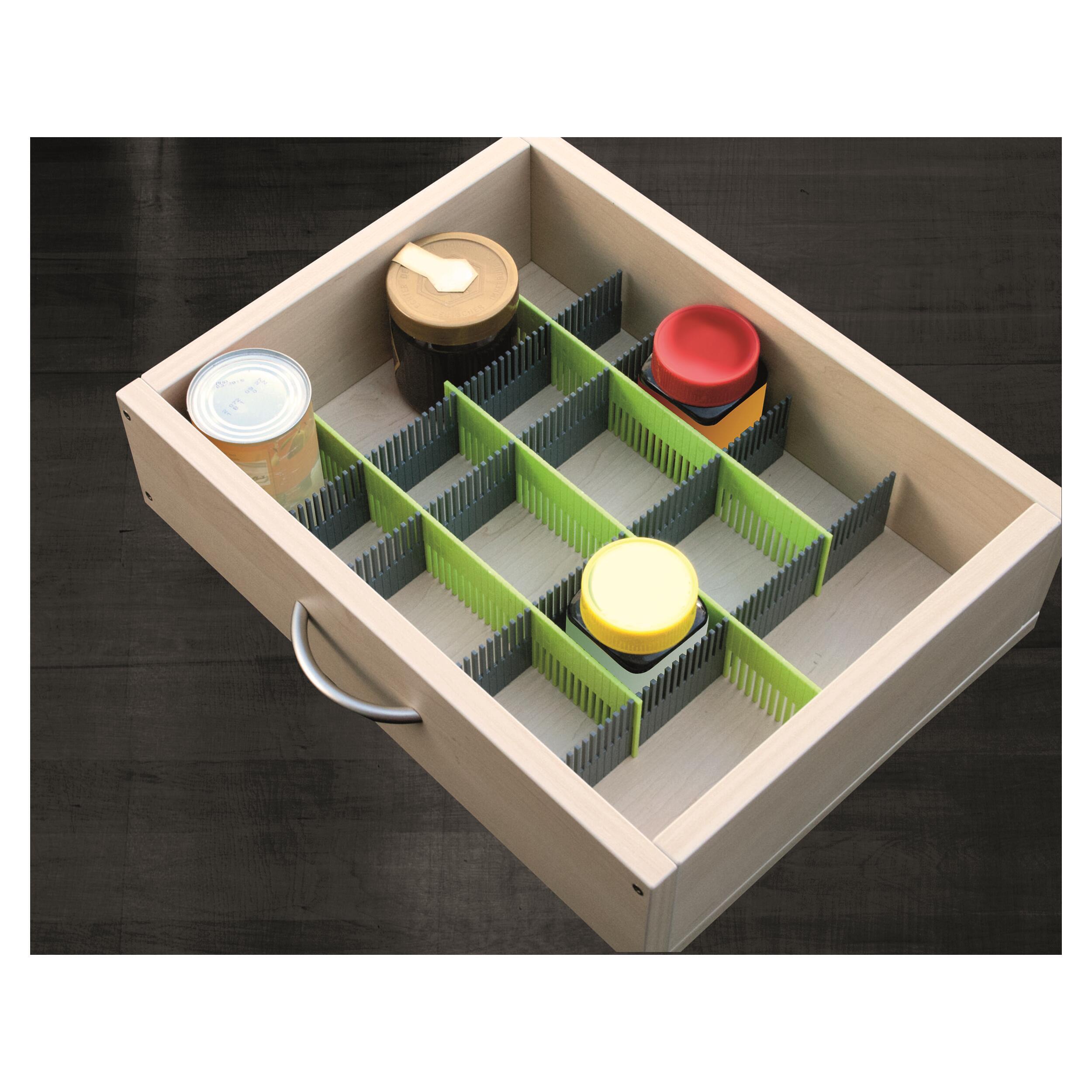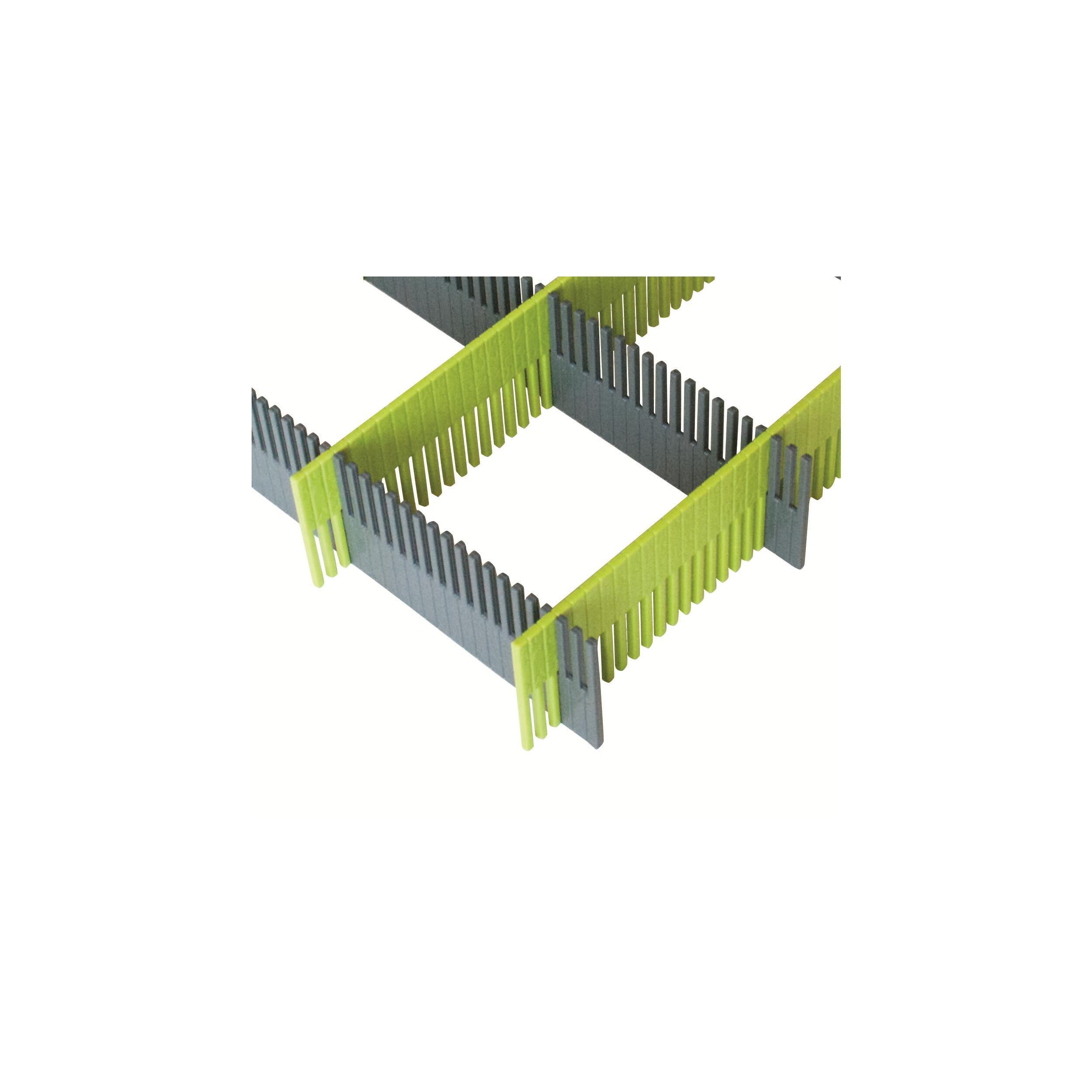 4 séparateurs sont verts et les 4 autres sont gris afin de mieux différencier ceux en dessous de ceux au dessus. Ainsi, les espaces de rangement s'adaptent à vos tiroirs, placards et frigo. Pour le modèle pour frigo, les séparateurs peuvent se clipser sur les grilles du réfrigérateur. Malin !