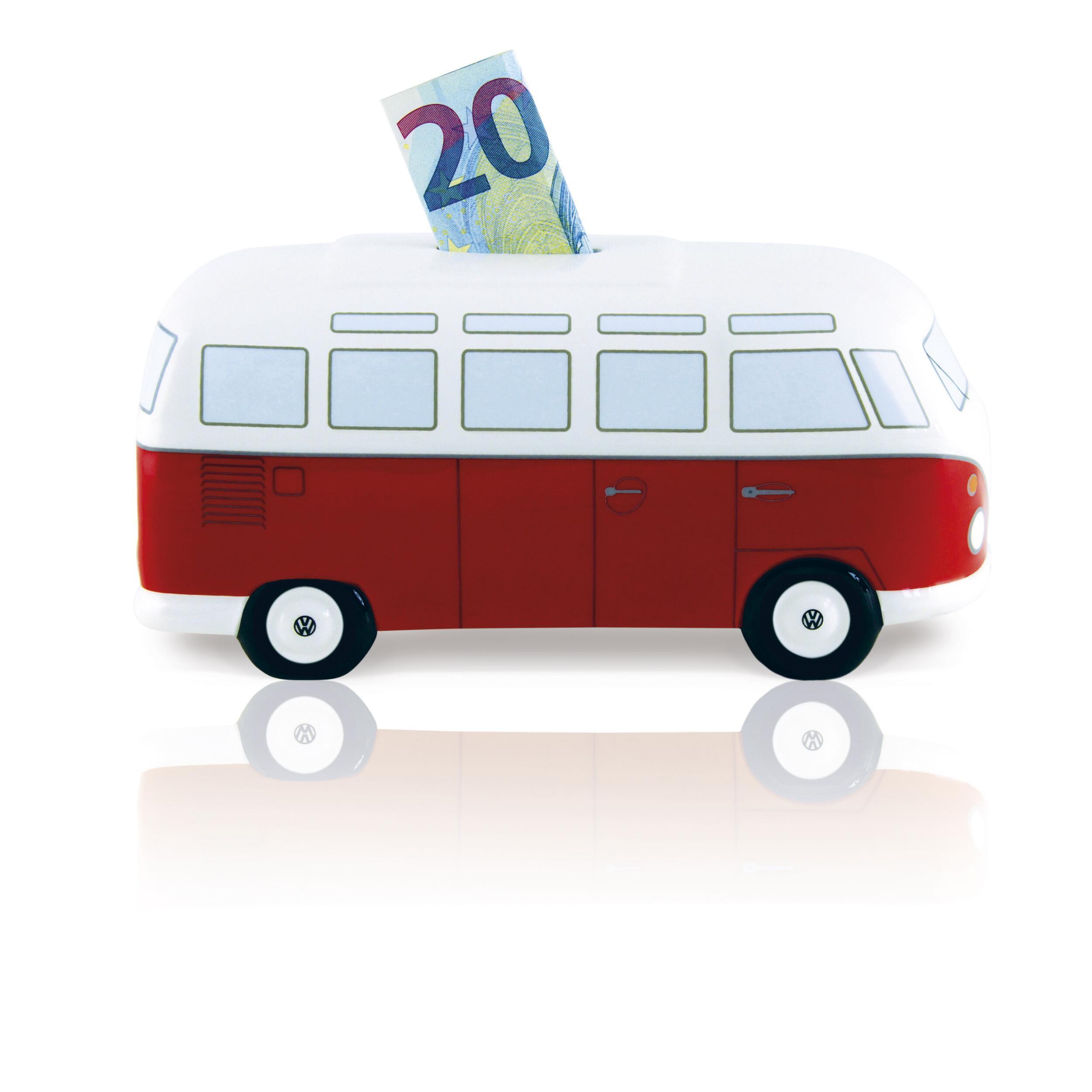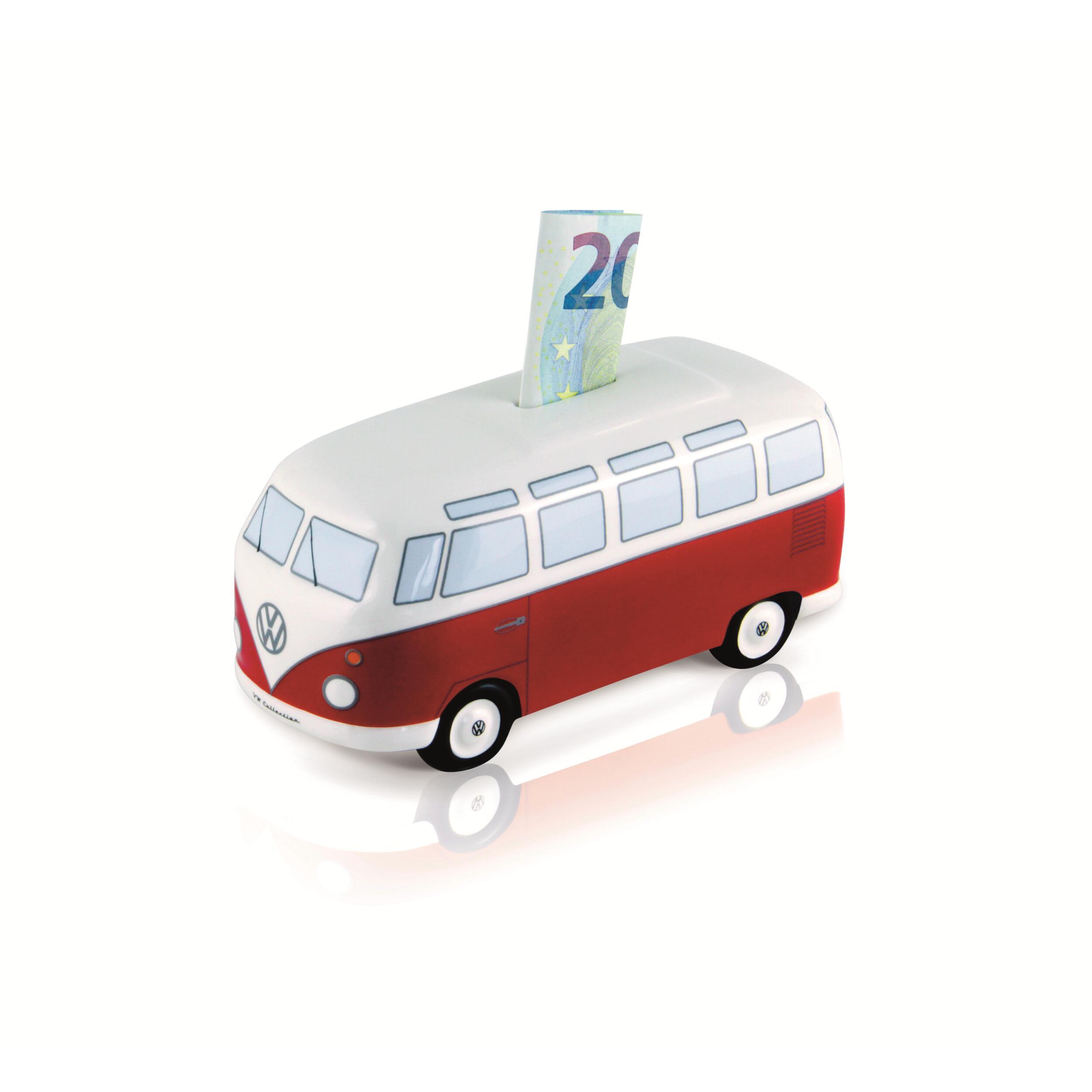 Une tirelire en céramique de la marque VW Collection, inspirée du légendaire bus VW T1, parfaite pour les amateurs de VW.