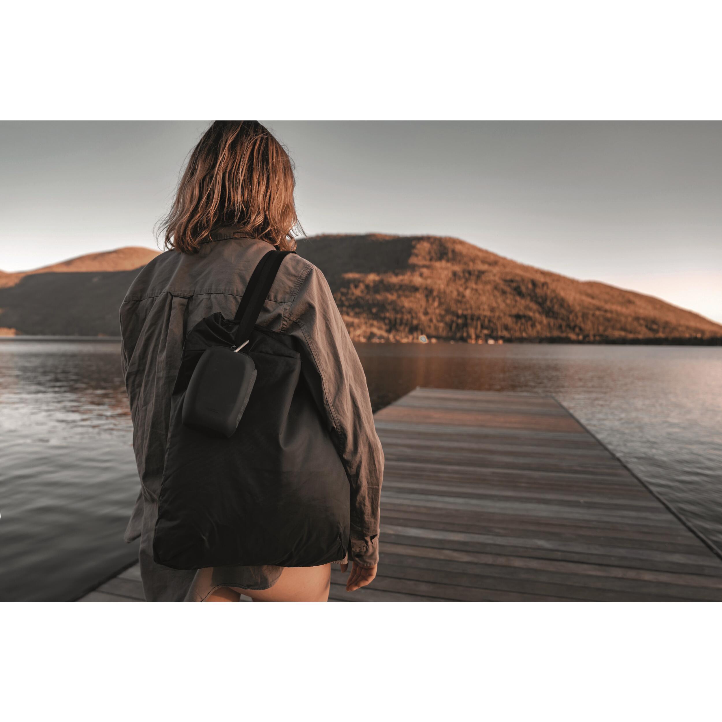 Côté transport, elle est livrée avec un étui en silicone ventilé et un mousqueton en aluminium anodisé : on l’accroche au sac ou à une poignée, on la garde séparée du reste des affaires, et la ventilation limite les odeurs tout en accélérant le séchage. Lavable en machine, elle s’entretient sans prise de tête.