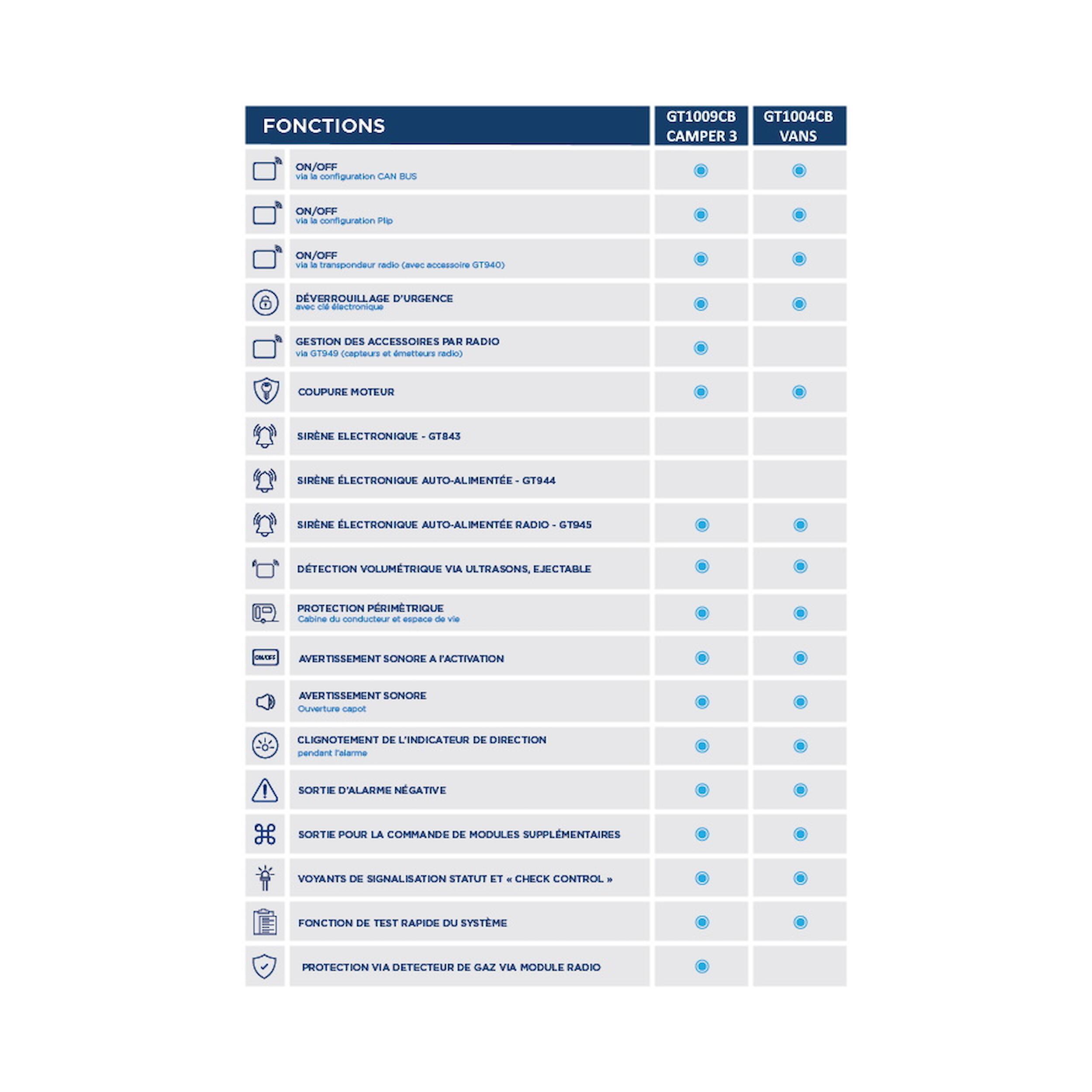 Le GT1009CB est un système d’alarme complet conçu pour protéger efficacement la cellule, la cabine, les portes, hublots, coffres et vitres de votre véhicule de loisirs.