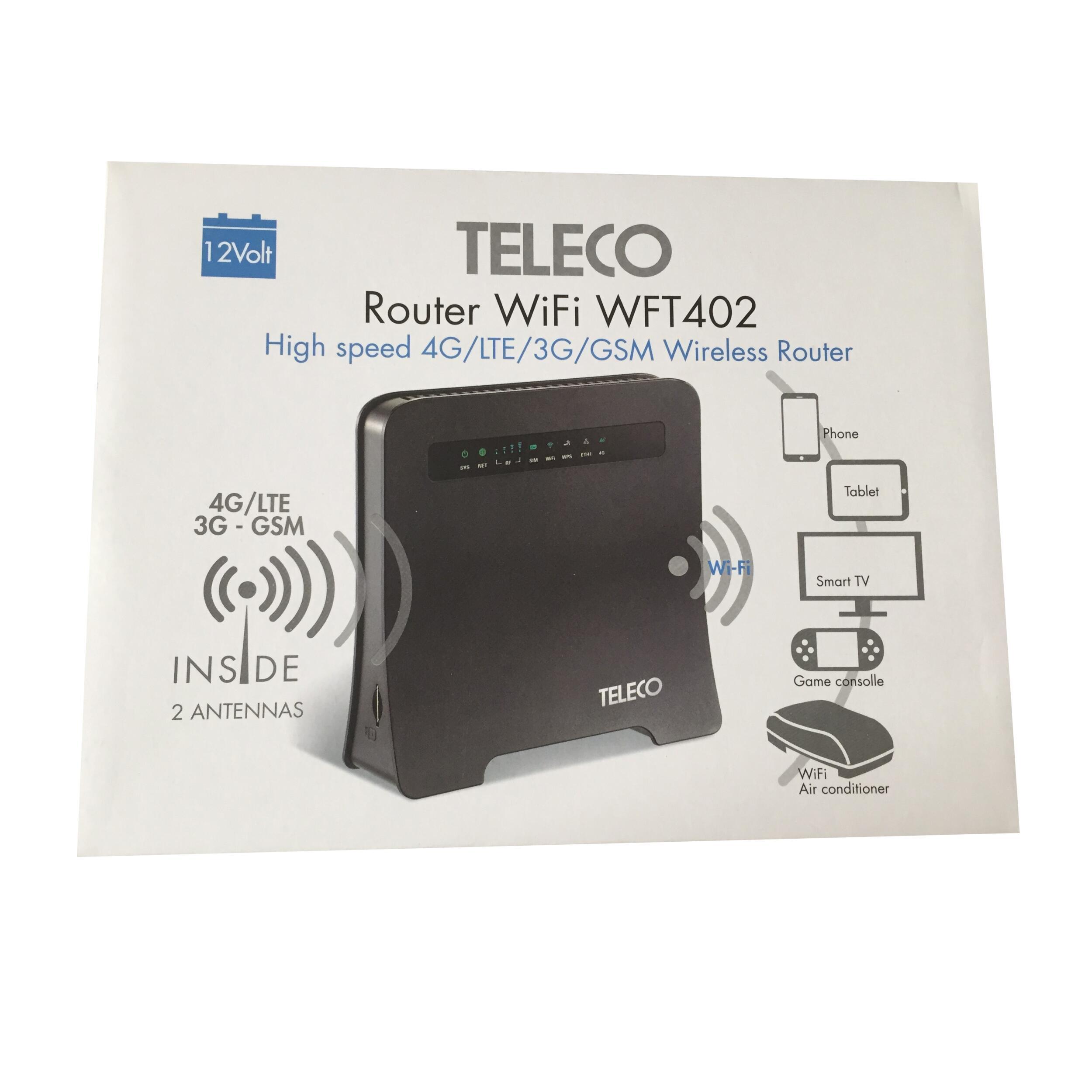 L'alimentation du Routeur TELECO Wifi WFT402 se fait sur du 12 Volts (DC 10,5 - 14,5 V/1A) ainsi que sur une prise allume-cigare 12 Volts DC.