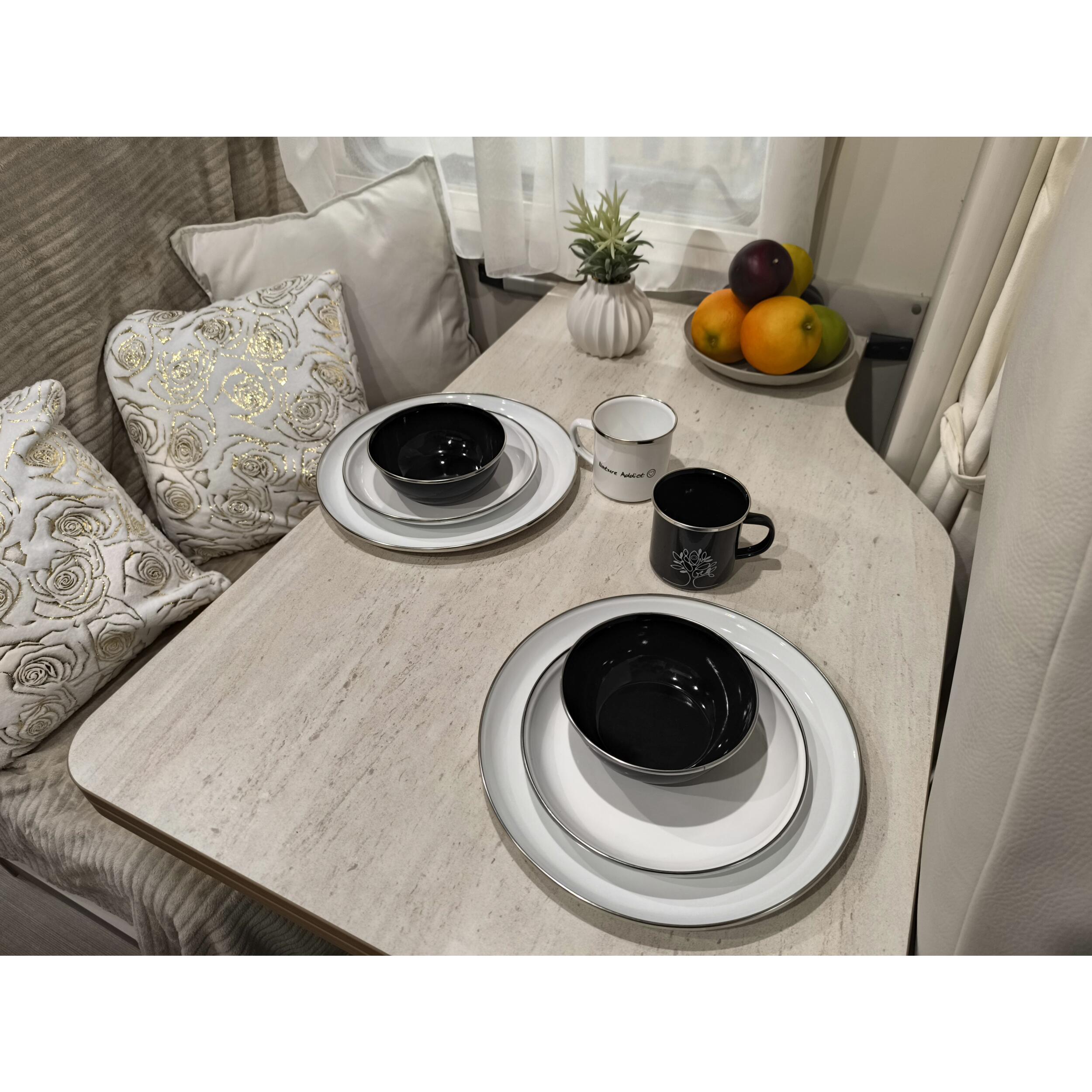 Idéal pour manger partout sans compromis, ce pack de vaisselle en acier émaillé Incasa est pensé pour tous vos repas nomades, du petit-déj à la soupe du soir. Composé de 6 pièces indispensables — 2 assiettes plates, 2 assiettes creuses et 2 bols — il vous suit fidèlement en van, camping-car, caravane ou en bivouac.