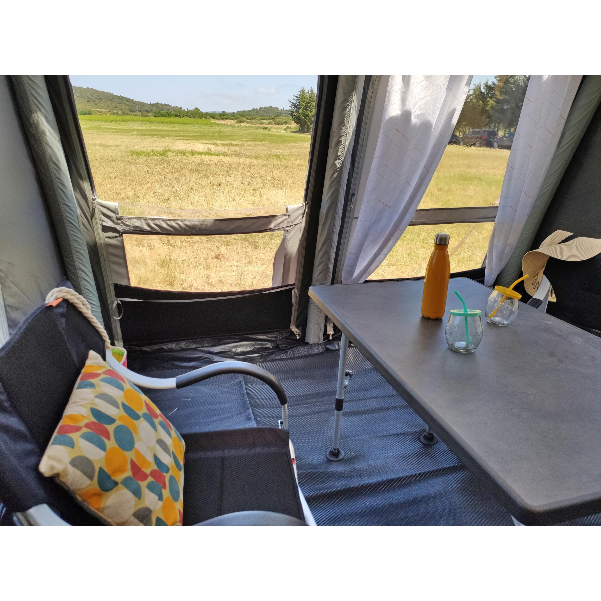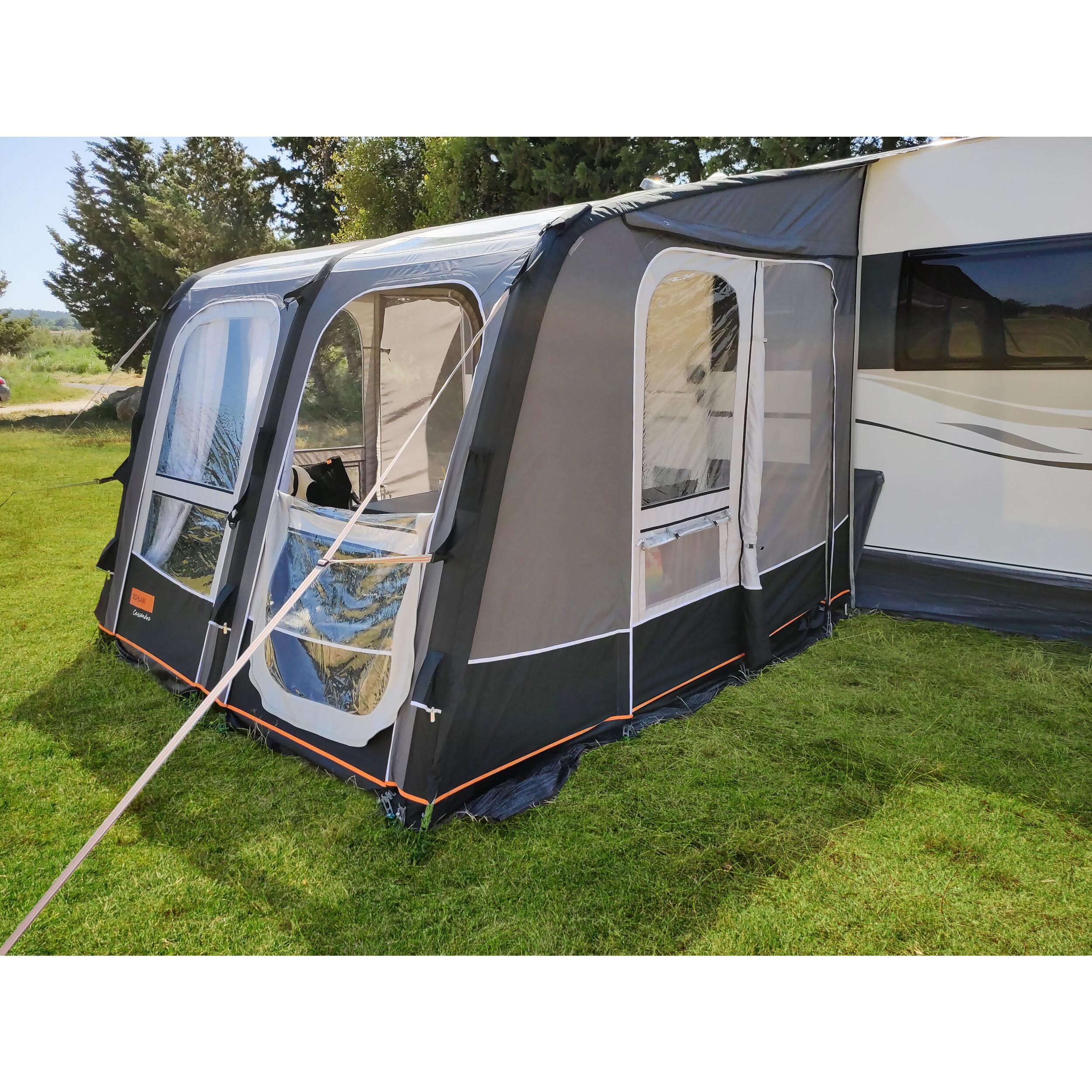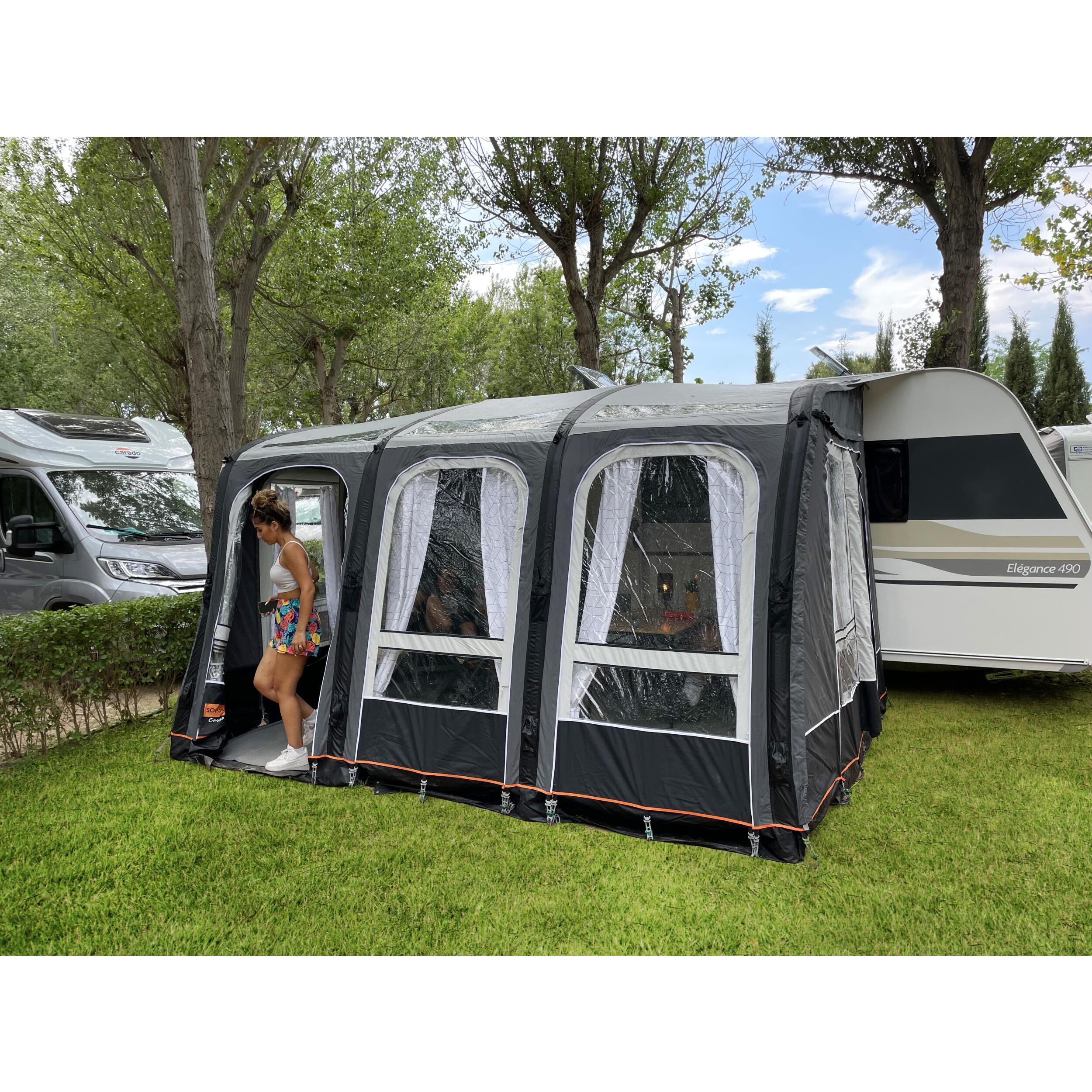 L'installation est simple et rapide : insérez-le dans le rail de votre caravane et gonflez la structure en un seul point. Les fenêtres en cristal sur la façade et le toit apportent une grande luminosité à l'intérieur.