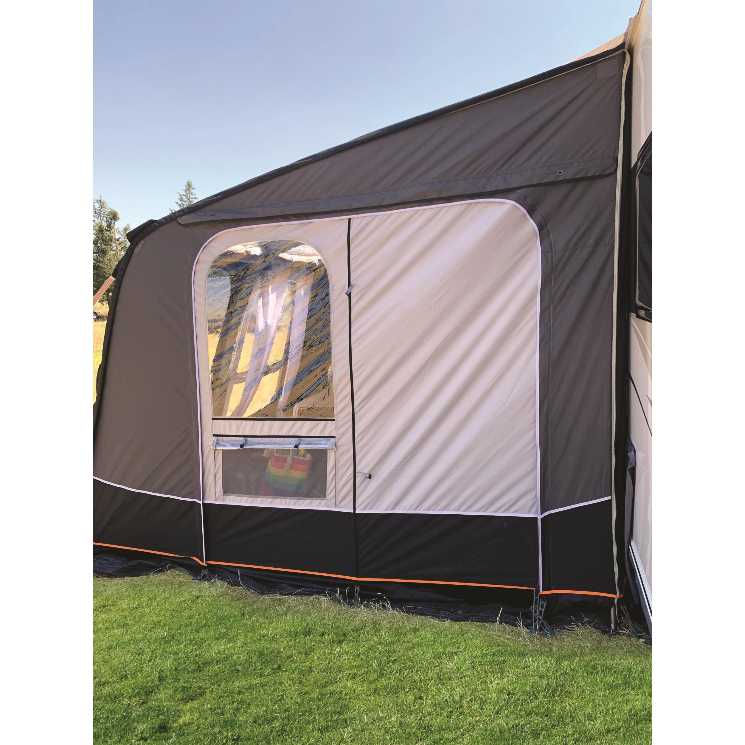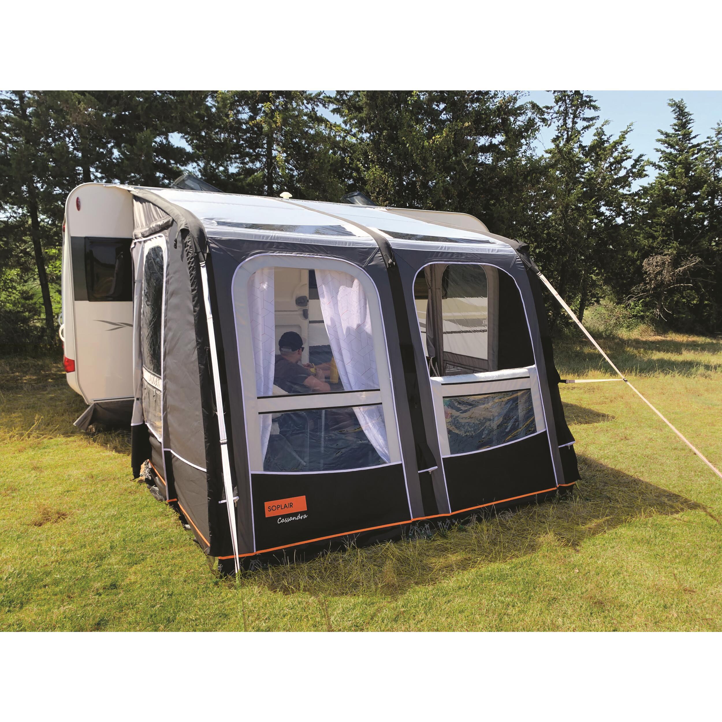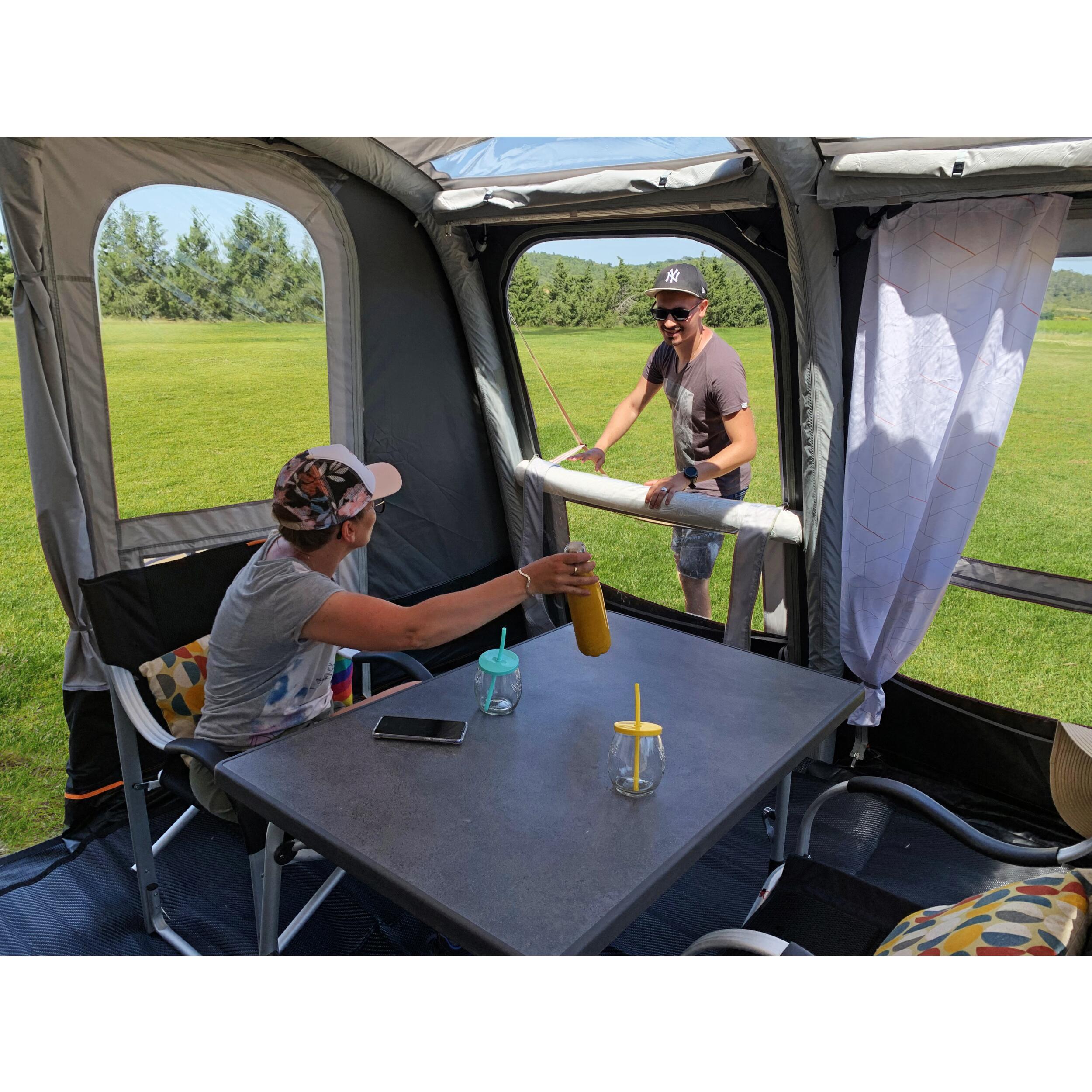 L'installation est simple et rapide : insérez-le dans le rail de votre caravane et gonflez la structure en un seul point. Les fenêtres en cristal sur la façade et le toit apportent une grande luminosité à l'intérieur.