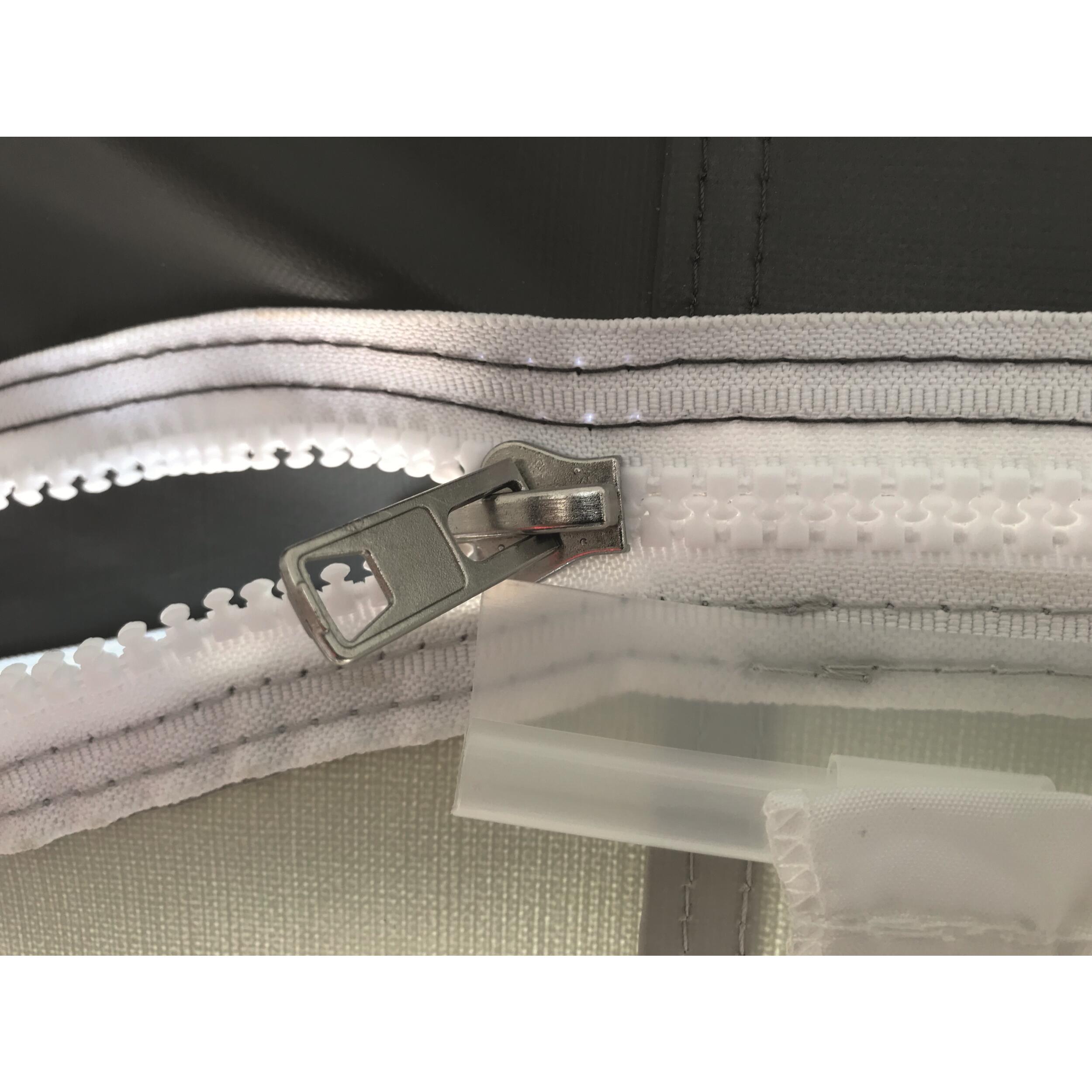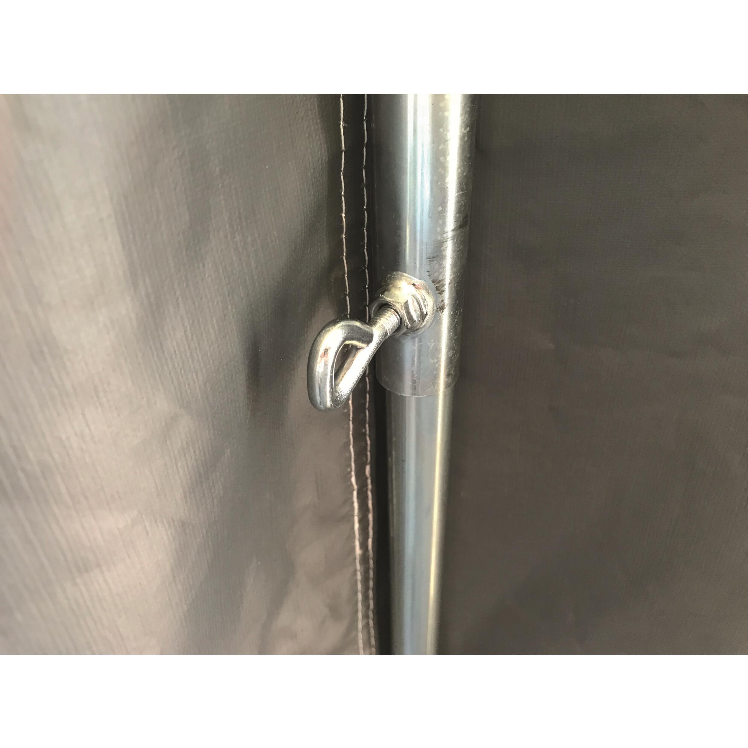 La toile de l'auvent pour les murs et la façade est une toile en PVC (350 g/m2) imperméable et résistante. De plus, le toit est en polyester enduit (270 g/m2) pour une meilleure résistance (par exemple sous les arbres). L'armature est en acier (diamètre de 25 mm), avec des ventouses, pour assurer une bonne tenue de l'auvent traditionnel.