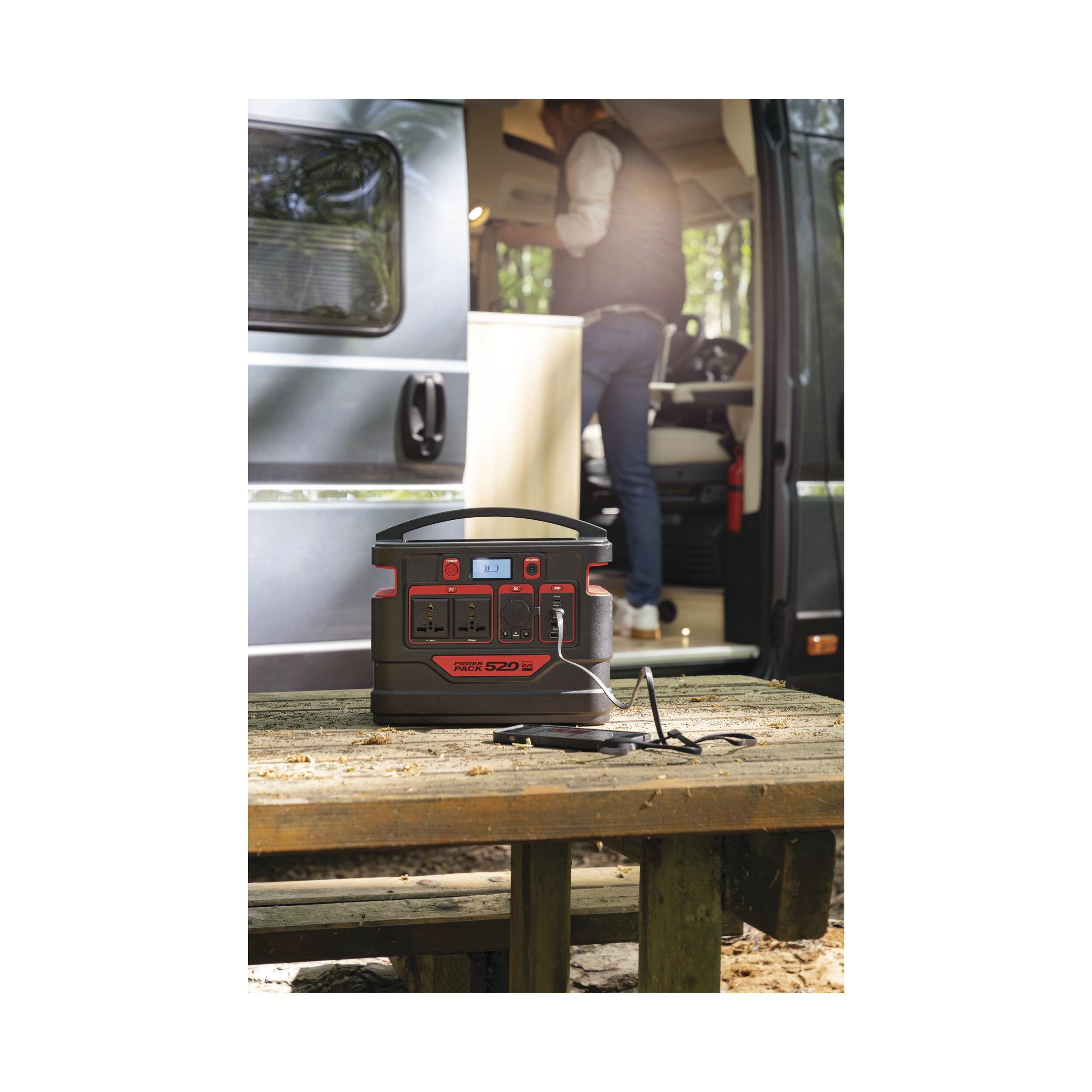 Sortie allume-cigare 12 V, Sortie 12 V - 10 A (x2), Entrée / Sortie USB Type-C, Sortie USB Quick charge 5 V - 3 A / 9 V - 2 A / 12 V - 1.5 A, Double sortie USB simple 5 V - 3.1 A (2.4 A max par sortie), Double prise AC 230 V / 50 Hz / 500 W.