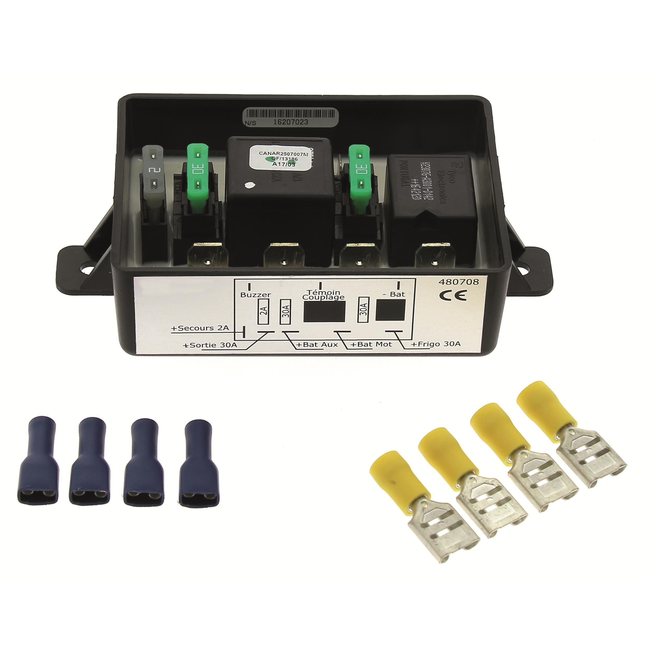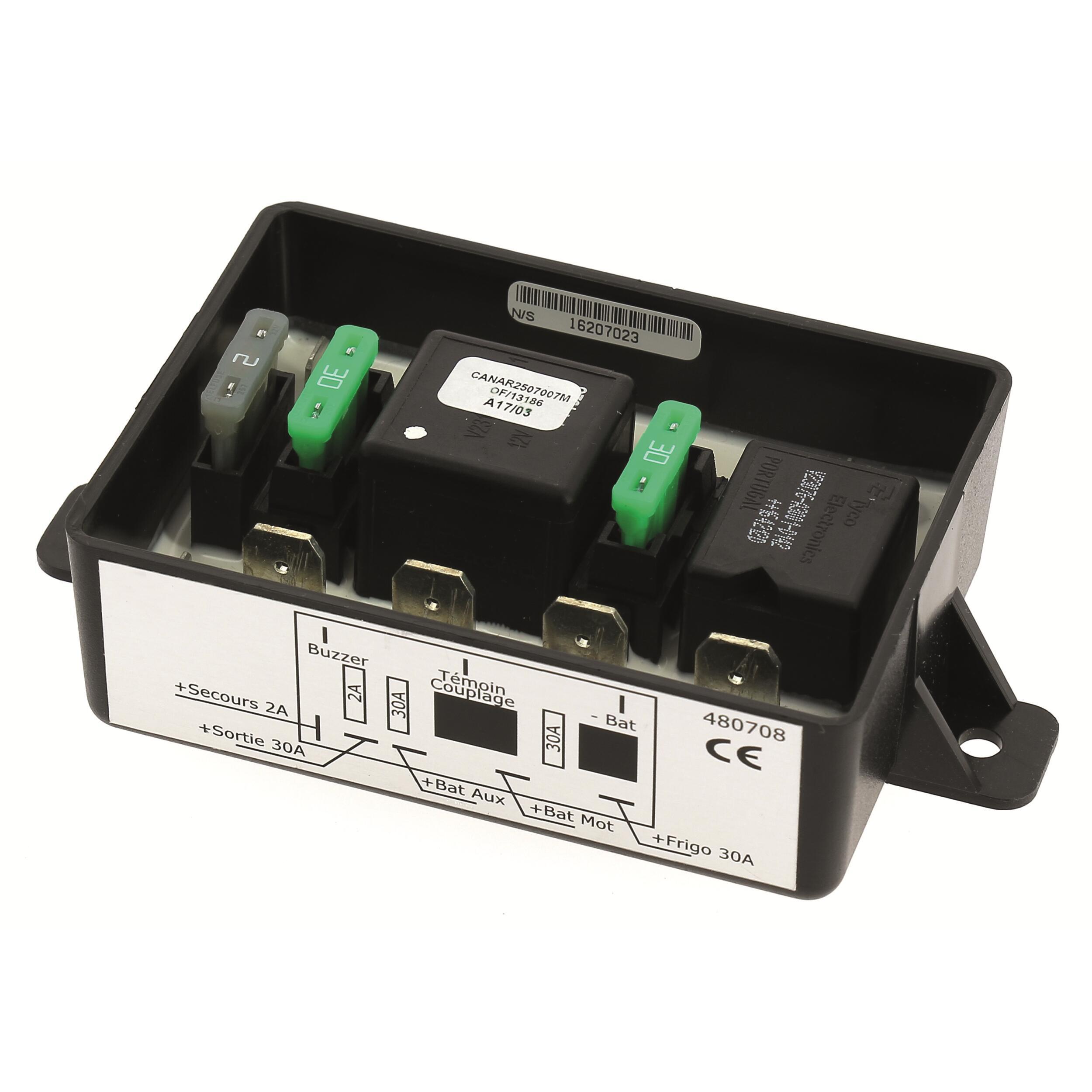 Le coupleur séparateur de batterie permet de mettre en parallèle votre batterie de démarrage (batterie moteur) et vos batteries auxiliaires. Il connecte et déconnecte automatiquement les batteries installées en parallèle selon des seuils de tension prédéfinis. Il assure à la batterie moteur de ne jamais se décharger complètement pour que vous puissiez redémarrer sans problème. Il préserve vos batteries d'une décharge complète qui pourrait les endommager. Le coupleur séparateur assure la charge de toutes les batteries en donnant la priorité à la batterie moteur et dès lors que la batterie moteur passe au-dessus de 13,5 volts, toutes les batteries sont chargées simultanément. Le courant de charge maximum est de 70 ampères. Convient pour des batteries de capacité individuelle jusqu'à 300 Ampères.