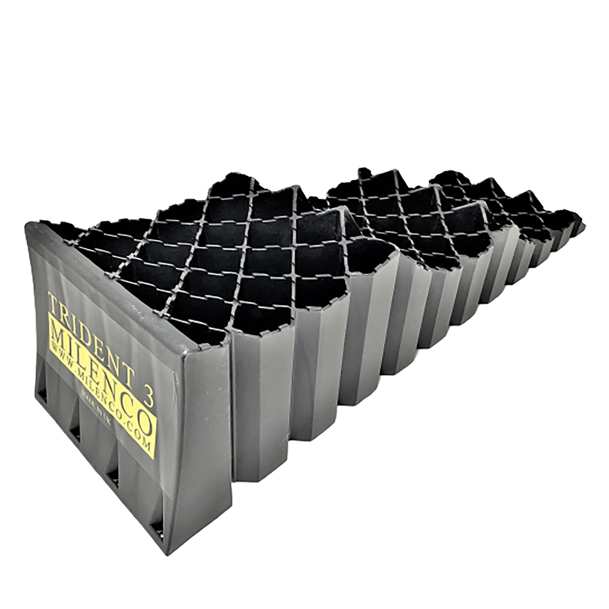 Les cales Trident de la marque Milenco sont parfaites pour stabiliser un véhicule de loisirs avec des pneus larges.