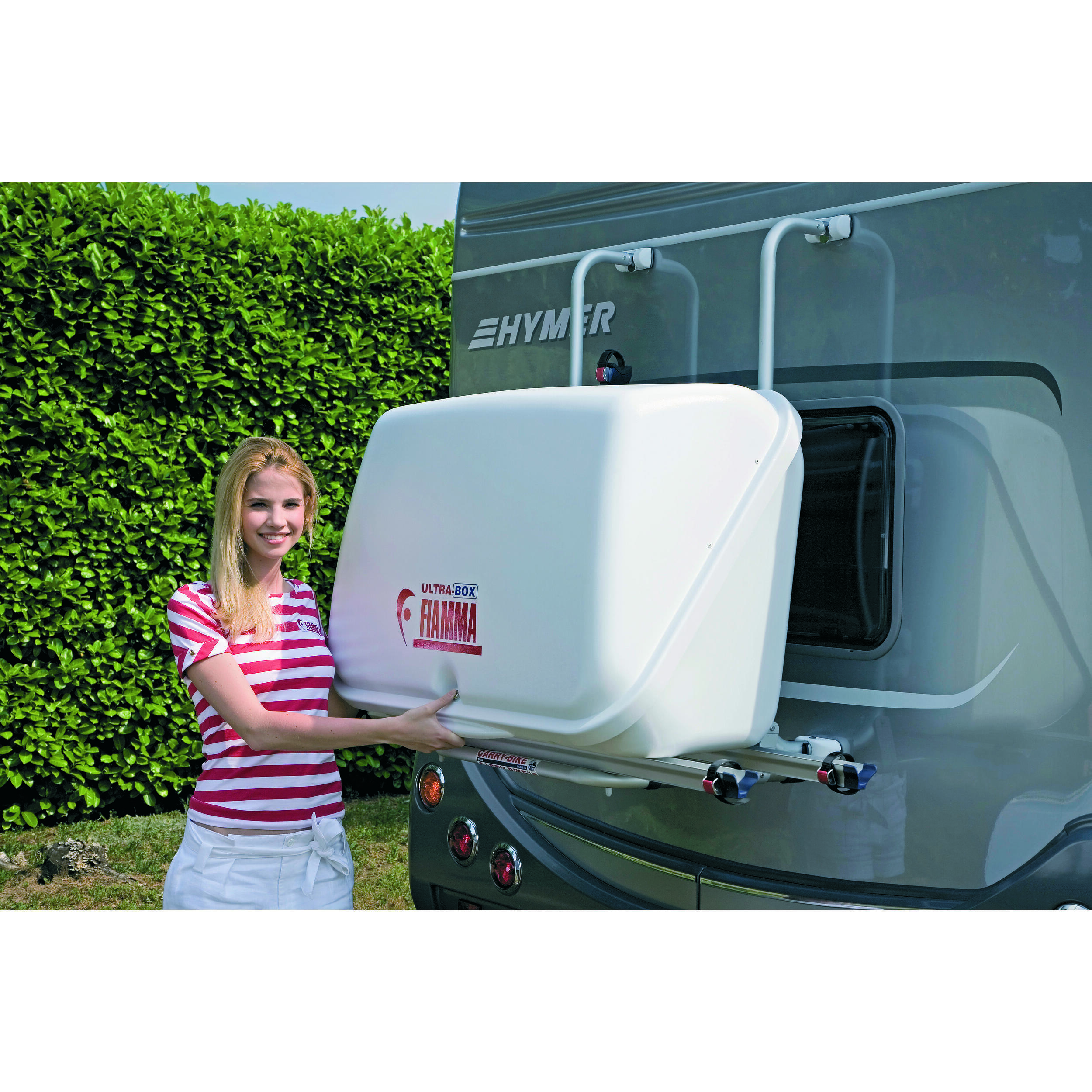 Coffre arrière Ultra Box Fiamma pour camping-car. Solution de rangement pour camping-car qui peut être fixé sur un porte-vélos. Ce coffre très pratique et utile vous permet d'augmenter votre capacité de chargement(dans la limite de la charge maximale) et vous permettra de stocker du matériel supplémentaire qui ne serait pas rentré dans votre soute ou l'intérieur de votre véhicule de loisirs. En plastique ABS Plus, il s'avère très résistant. Il est également doté d'une fermeture à clé et d'un filet intérieur.